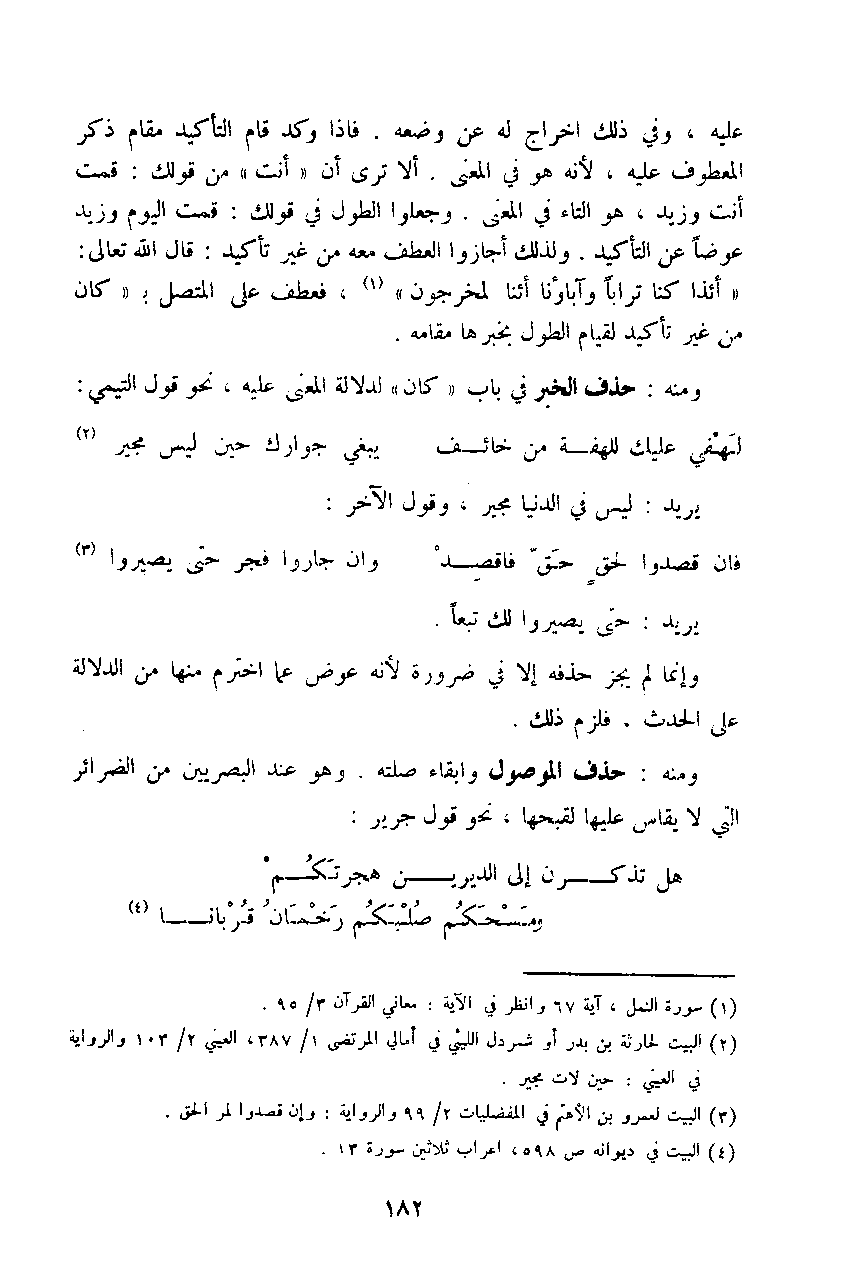 ومنه: حذف الموصول وإبقاء صلته. وهو عند البصريين من الضرائر التي لا يقاس عليها لقبحها، نحو قول جرير: