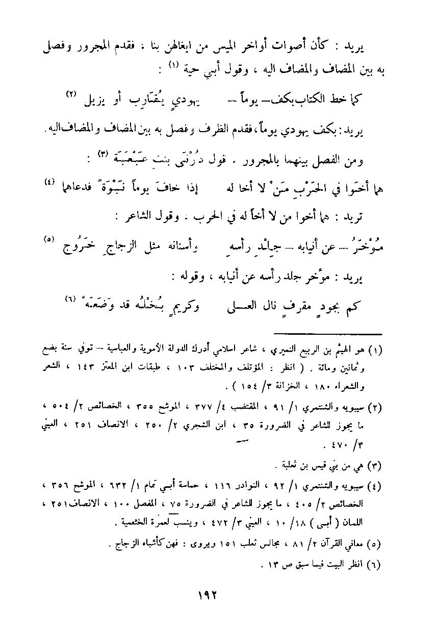 يريد: كأن أصوات أواخر الميس من إيغالهن بنا، فقدم المجرور وفصل به بين المضاف والمضاف إليه، وقول أبي حية: (الوافر)