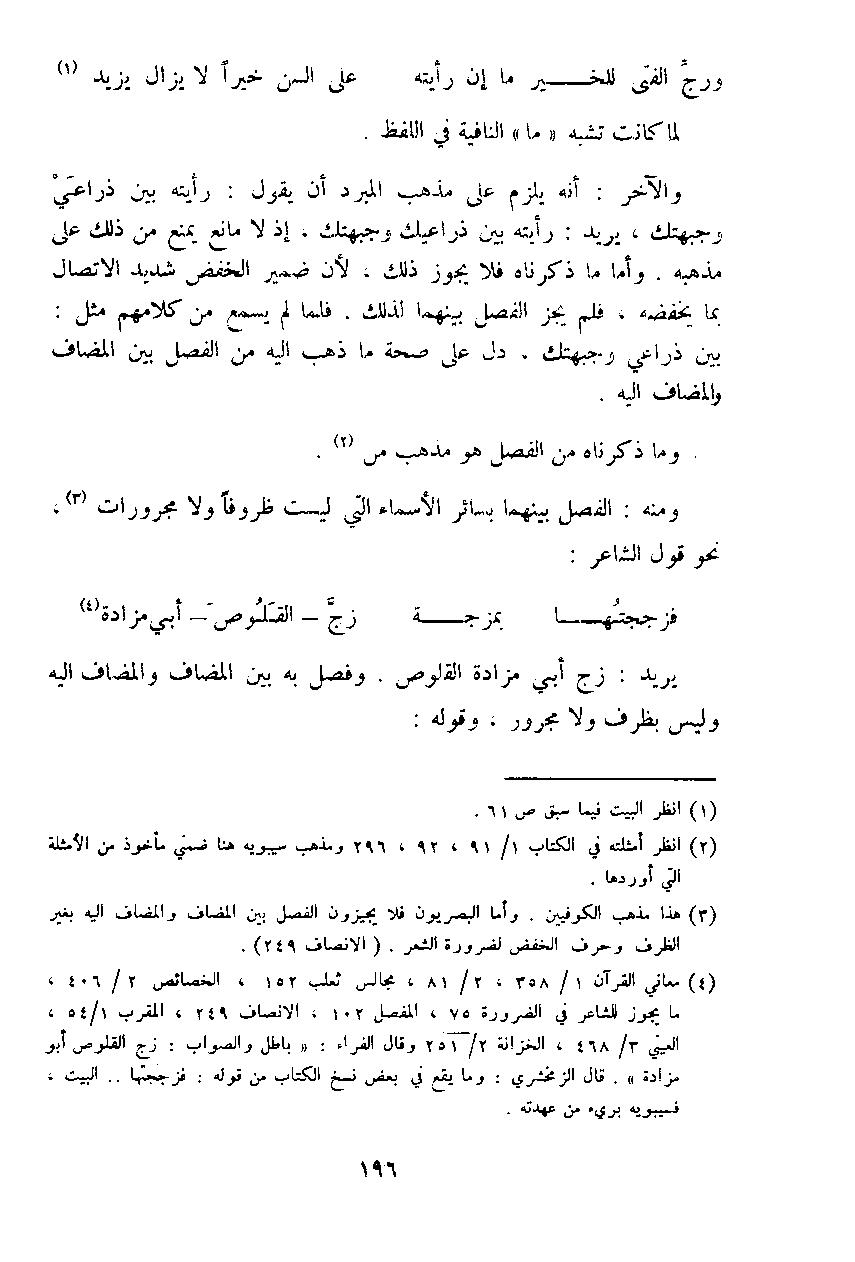 والآخر: أنه يلزم على مذهب المبرد أن يقول: رأيته بين ذراعي وجبهتك، يريد: رأيته بين ذراعيك وجبهتك، إذ لا ما نع يمنع من ذلك على مذهبه. وأما ما ذكرناه