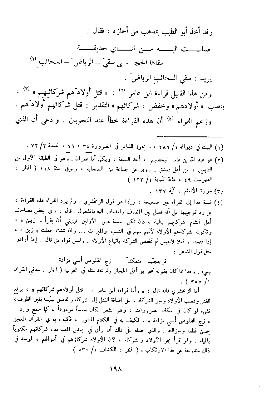 ومن هذا القبيل قراءة ابن عامر: (قتل أولادَهم شركائِهم) بنصب (أولادهم) وخفض (شركائهم) التقدير: قتل شركائهم أولادَهم.