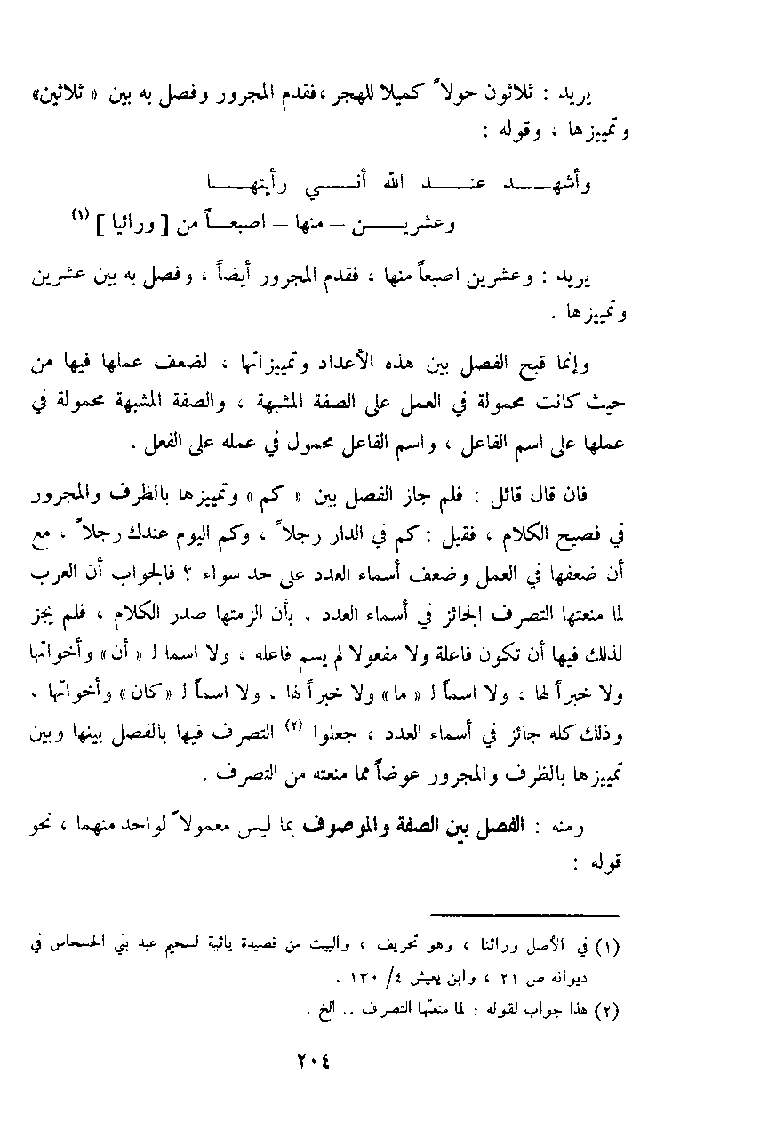 فإن قال قائل: فلم جاز الفصل بين (كم) وتمييزها بالظرف والمجرور في فصيح الكلام، فقيل: كم في الدار رجلاً، وكم اليوم عندك رجلاً، مع أن ضعفها في العمل وضعف أسماء العدد على حد سواء؟ فالجواب أن العرب لما منعتها التصرف الجائز في أسماء العدد، بأن ألزمتها صدر الكلام، فلم يجز لذلك فيها أن تكون فاعلة ولا مفعولاً لم يسم فاعله، ولا اسماً لـ (أن) وأخواتها ولا خبراً لها، ولا اسماً لـ (ما) ولا خبراً لها، ولا اسماً لـ (كان) وأخواتها، وذلك كله جائز في أسماء العدد، جعلوا التصرف فيها بالفصل بينها وبين تمييزها بالظرف والمجرور عوضاً مما منعته من التصرف.