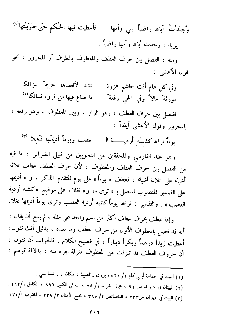 وإذا عطف بحرف عطف أكثر من اسم واحد على مثله، لم يسع أن يقال: إنه قد فصل بالمعطوف الأول من حرف العطف وما بعده، بدليل أنك تقول: أعطيت زيداً درهماً وبكراً ديناراً، في فصيح الكلام. فالجواب أن تقول: إن حروف العطف قد تنزلت من المعطوف منزلة جزء منه، بدلالة قولهم:
