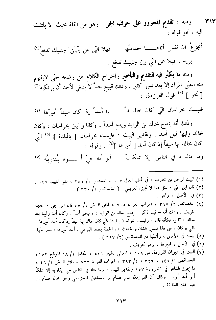 ومنه ما يكثر فيه التقديم والتأخير وإخراج الكلام عن وضعه حتى لا يفهم منه المعنى المراد إلا بعد تدبر كثير. وذلك قبيح جداً لا ينبغي لأحد أن يرتكبه (نحو) قول الفرزدق: