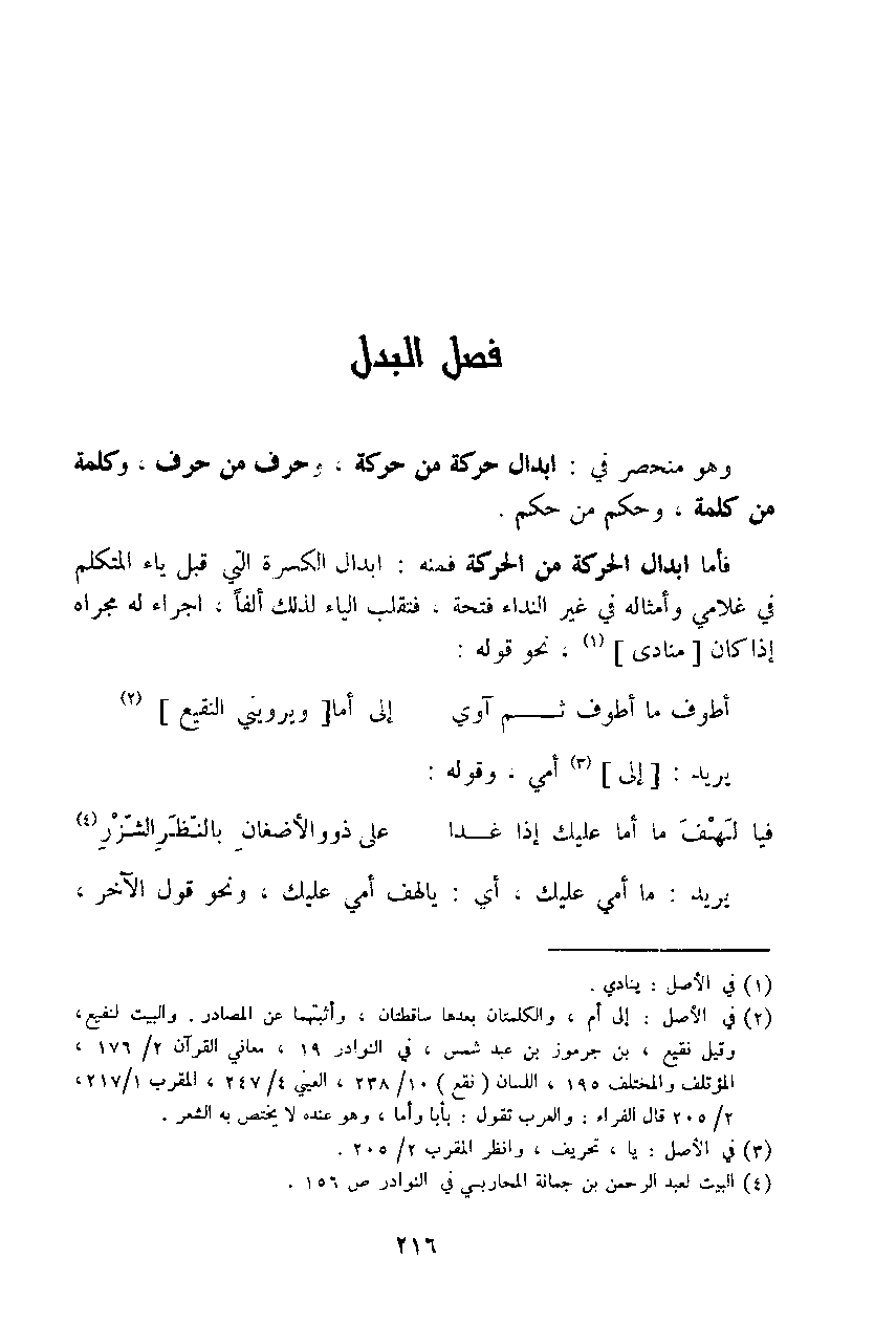 فأما إبدال الحركة من الحركة فمنه: إبدال الكسرة التي قبل ياء المتكلم في غلامي وأمثاله في غير النداء فتحة، فتقلب الياء لذلك ألفاً، إجراء له مجراه إذا كان (منادي)، نحو قول: