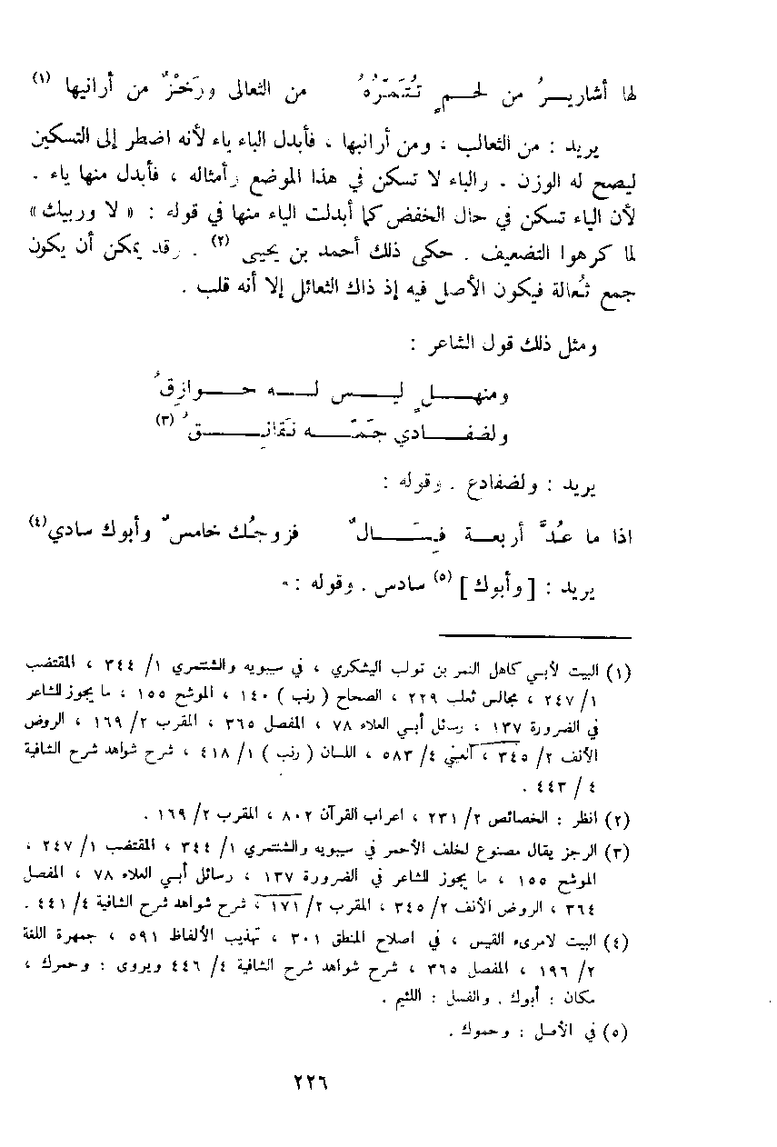 يريد: من الثعالب، ومن أرانبها، فأبدل الباء ياء لأنه اضطر إلى التسكين ليصح له الوزن، والباء لا تسكن في هذا الموضع وأمثاله، فأبدل منها ياء، لأن الياء تسكن في حال الخفض كما أبدلت الياء منها في قوله: (لا وربيك) لما كرهوا التضعيف. حكى ذلك أحمد بن يحيى. وقد يمكن أن يكون جمع ثعالة فيكون الأصل فيه إذ ذاك الثعائل إلا أنه قلب.