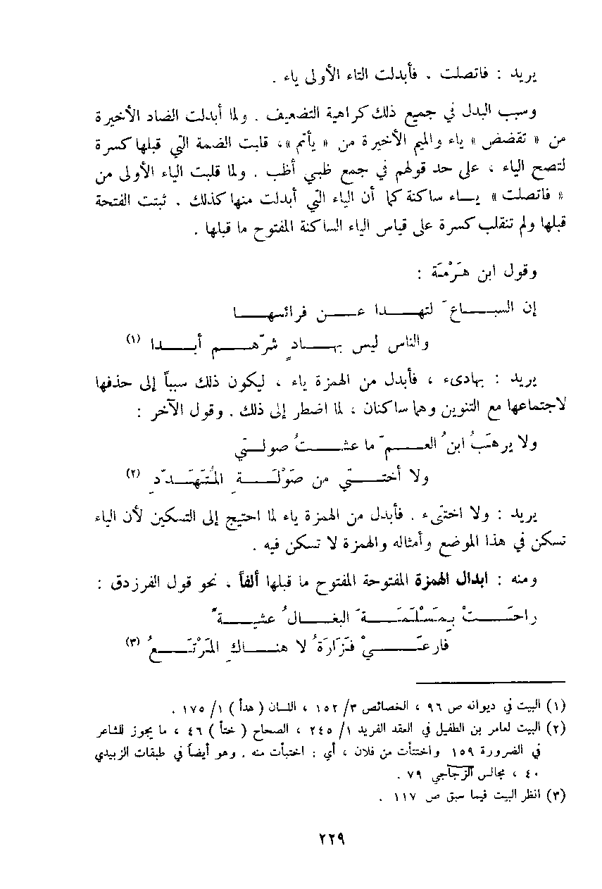 وسبب البدل في جميع ذلك كراهية التضعيف. ولما أبدلت الضاد الأخيرة من (تقضض) ياء والميم الأخيرة من (يأتم)، قلبت الضمة التي قبلها كسرة لتصح الياء، على حد قولهم في جميع ظبي أظب. ولما قلبت الياء الأولى من (فاتصلت) ياء ساكنة كما أن الياء التي أبدلت منها كذلك، ثبتت الفتحة قبلها ولم تنقلب كسرة على قياس الياء الساكنة المفتوح ما قبلها.