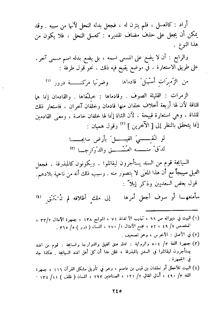 والرابع: أن لا يضع على المسمى اسمه، بل يضع بدله اسم مسمى آخر، على طريق الاستعارة، في موضع يقبح فيه ذلك، نحو قول طرفة: