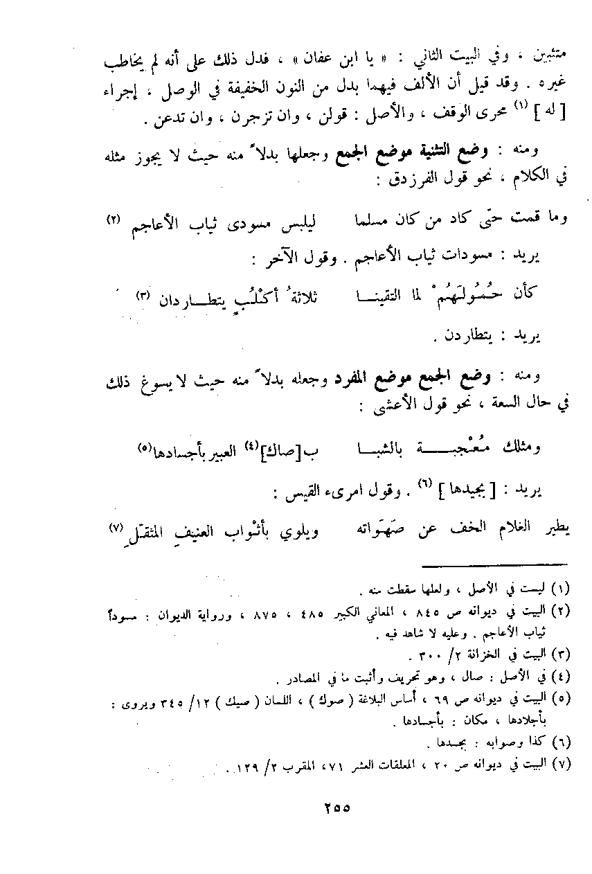 ومنه: وضع الجمع موضع المفرد وجعله بدلاً منه حيث لا يسوغ ذلك في حال السعة، نحو قول الأعشى: