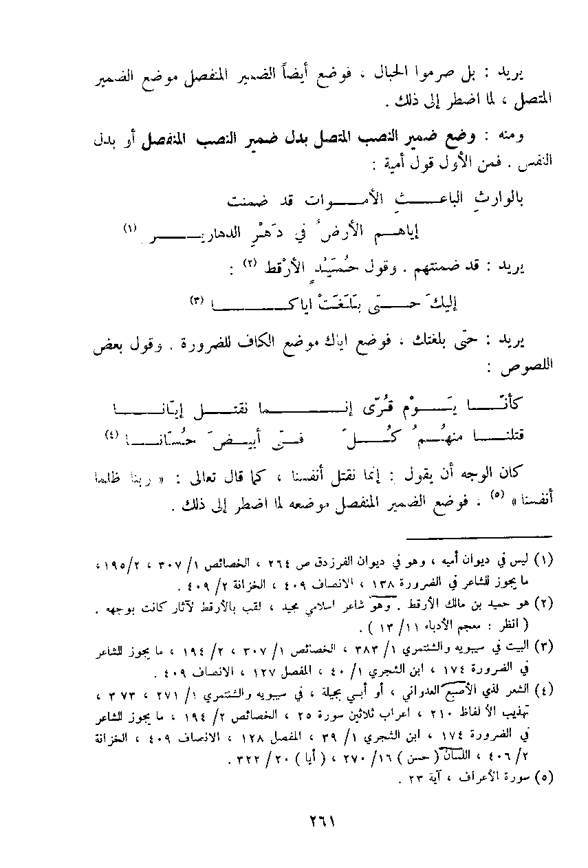ومنه: وضع ضمير النصب المتصل بدل ضمير النصب المنفصل أو بدل النفس. فمن الأول قول أمية: