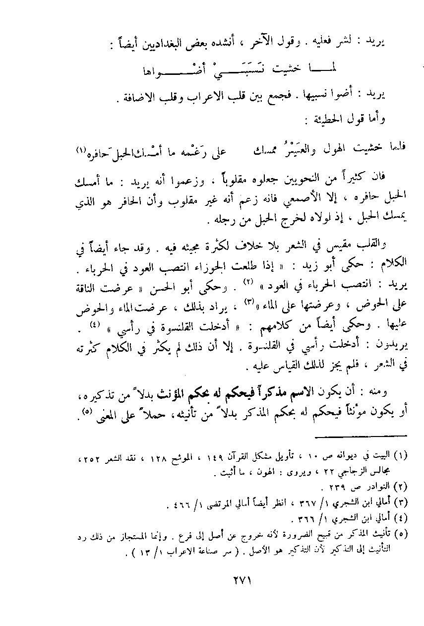 فإن كثيراً من النحويين جعلوه مقلوباً، وزعموا أنه يريد: ما أمسك الحبل حافره، إلا الأصمعي فإنه زعم أنه غير مقلوب وأن الحافر هو الذي يمسك الحبل، إذ لولاه لخرج الحبل من رجله.