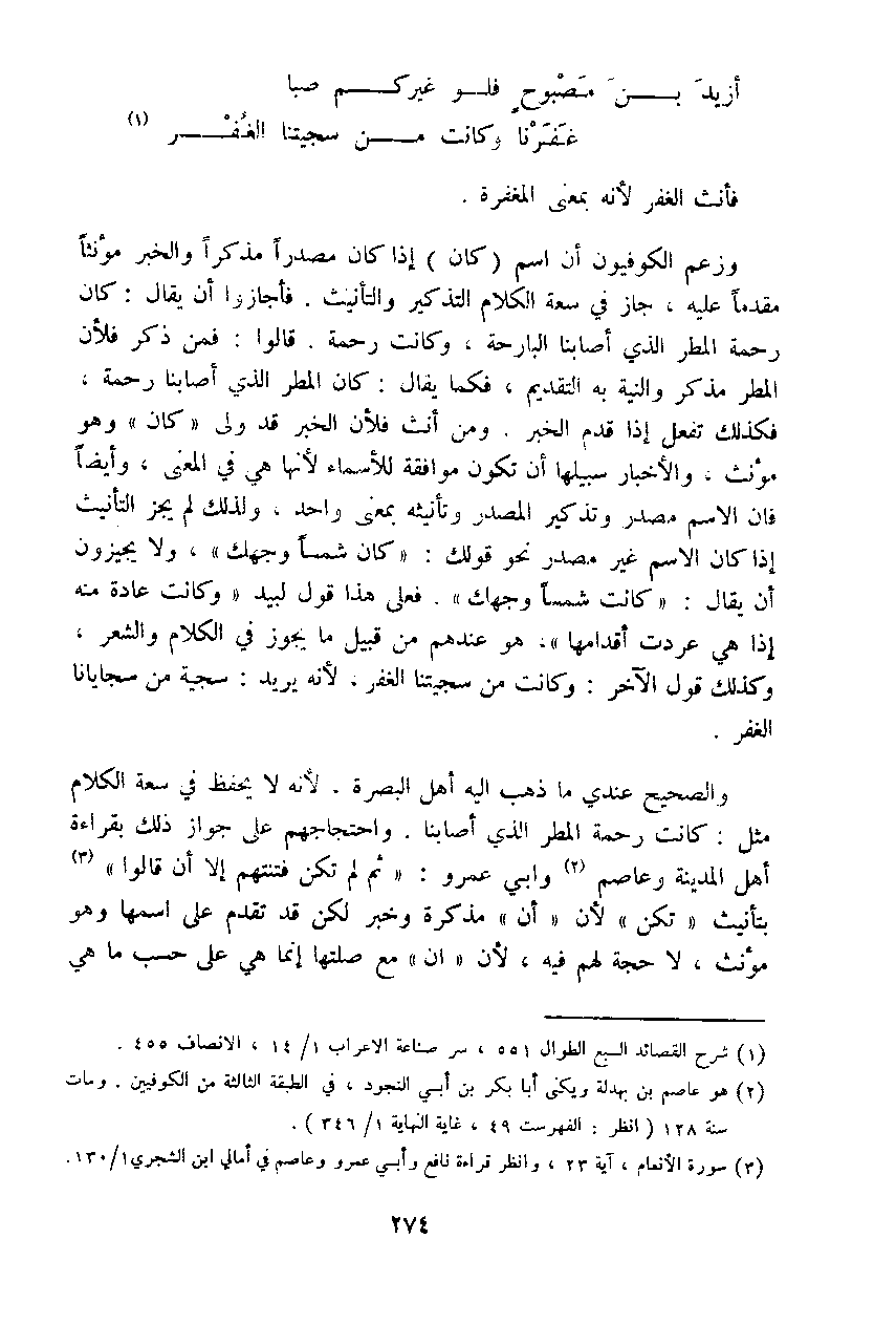 والصحيح عندي ما ذهب إليه أهل البصرة، لأنه لا يحفظ في سعة الكلام مثل: كانت رحمة المطر الذي أصابنا. واحتجاجهم على جواز ذلك بقراءة أهل المدينة وعاصم وأبي عمرو: (ثم لم تكن فتنتهم إلا أن قالوا) بتأنيث (تكن) لأن (أن) مذكرة وخبر لكن قد تقدم على اسمها وهو مؤنث، لا حجة لهم فيه، لأن (أن) مع صلتها إنما هي على حسب ما هي