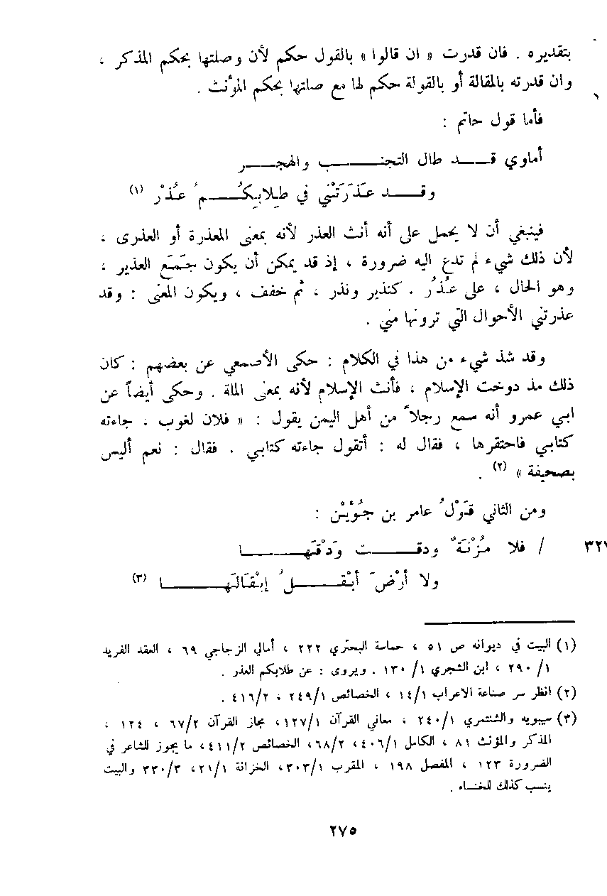 فينبغي أن لا يحمل على أنه أنث العذر لأنه بمعنى المعذرة أو العذري، لأن ذلك شيء لم تدع إليه ضرورة، إذ قد يمكن أن يكون جمع العذير، وهو الحال، على عذر، كنذير ونذر، ثم خفف، ويكون المعنى: وقد عذرتني الأحوال التي ترونها مني.