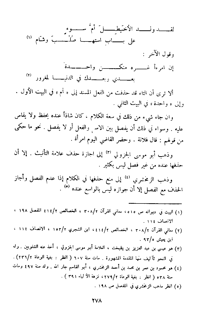 ألا ترى أن التاء قد حذفت من الفعل المسند إلى (أم) في البيت الأول، وإلى (واحدة) في البيت الثاني.