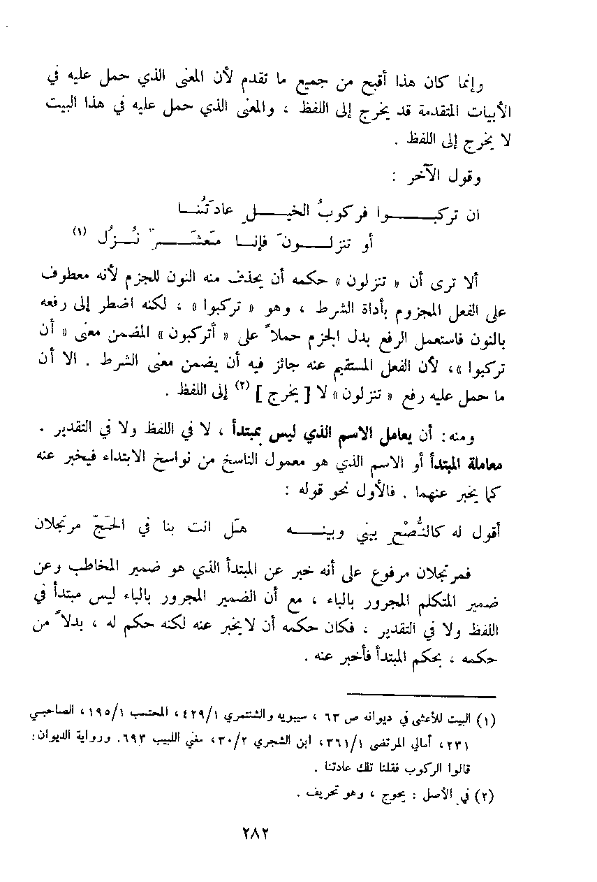 ألا ترى أن (تنزلون) حكمه أن يحذف منه النون للجزم لأنه معطوف على الفعل المجزوم بأداة الشرط، وهو (تركبوا)، لكنه اضطر إلى رفعه بالنون فأستعمل الرفع بدل الجزم حملاً على (أتركبون) المضمن معنى (أن تركبوا)، لأن الفعل المستقيم عنه جائز فيه أن يضمن معنى الشرط. إلا أن ما حمل عليه رفع (تنزلون) لا (يخرج) إلى اللفظ.