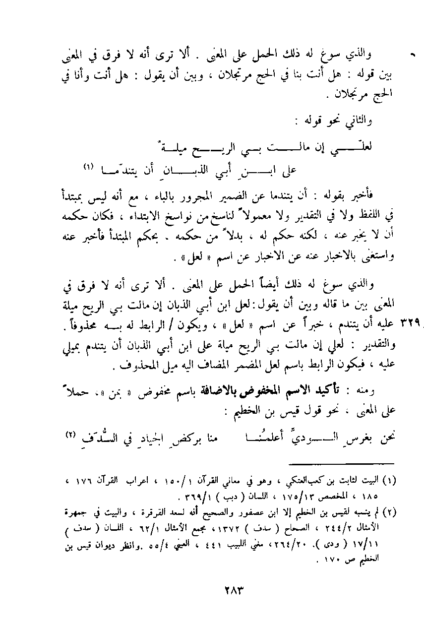 والذي سوغ له ذلك أيضاً الحمل على المعنى. ألا ترى أنه لا فرق في المعنى بين ما قاله وبين أن يقول: لعل ابن أبي الذبان إن مالت بي الريح ميلة عليه أن يتندم، خبراً عن اسم (لعل)، ويكون الرابط له به محذوفاً. والتقدير: لعلي إن مالت بي الريح ميلة علي ابن أبي الذبان أن يتندم بميلي عليه، فيكون الرابط باسم لعل المضمر المضاف إليه ميل المحذوف.