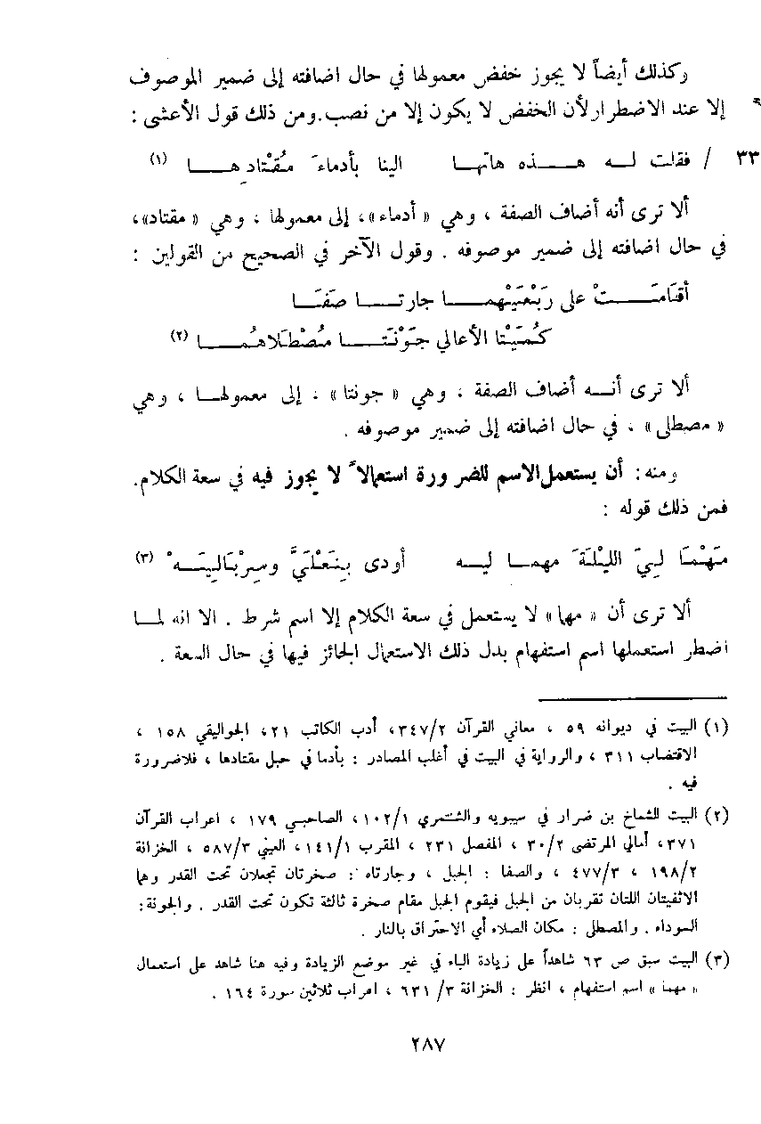 وكذلك أيضاً لا يجوز خفض معمولها في حال إضافته إلى ضمير الموصوف إلا عند الاضطرار لأن الخفض لا يكون إلا من نصب. ومن ذلك قول الأعشى:
