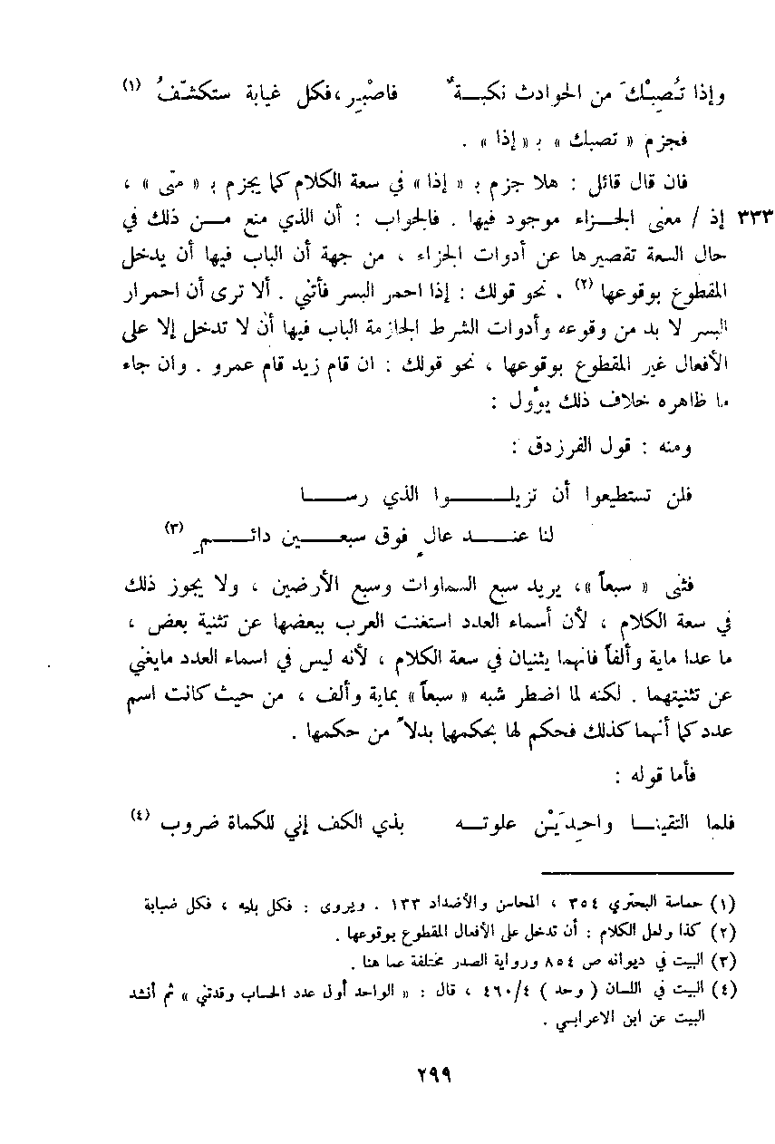 فثنى (سبعاً)، يريد سبع السماوات وسبع الأرضيين، ولا يجوز ذلك في سعة الكلام، لأن أسماء العدد استغنت العرب ببعضها عن تثنية بعض، ما عدا مائة وألفاً فإنهما يثنيان في سعة الكلام، لأنه ليس في أسماء العدد ما يغني عن تثنيتهما. لكنه لما اضطر شبه (سبعاً) بمائة وألف، من حيث كانت اسم عدد كما إنهما كذلك فحكم لها بحكمهما بدلاً من حكمها.