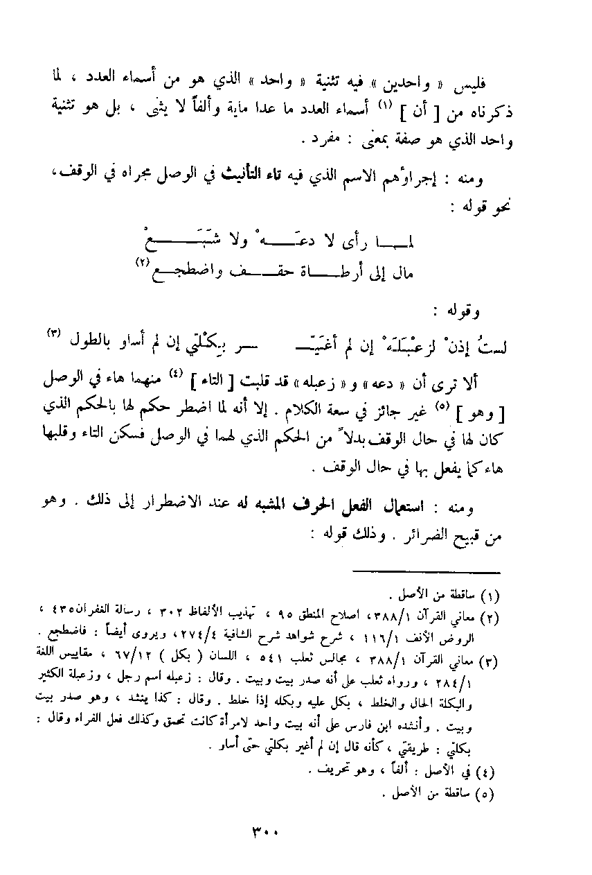 ألا ترى أن (دعه) و (زعبله) قد قلبت (التاء) منهما هاء في الوصل (وهو) غير جائز في سعة الكلام. إلا أنه لما اضطر حكم لها بالحكم الذي كان لها في حال الوقف بدلاً من الحكم الذي لهما في الوصل فسكن التاء وقلبها هاء كما يفعل بها في حال الوقف.