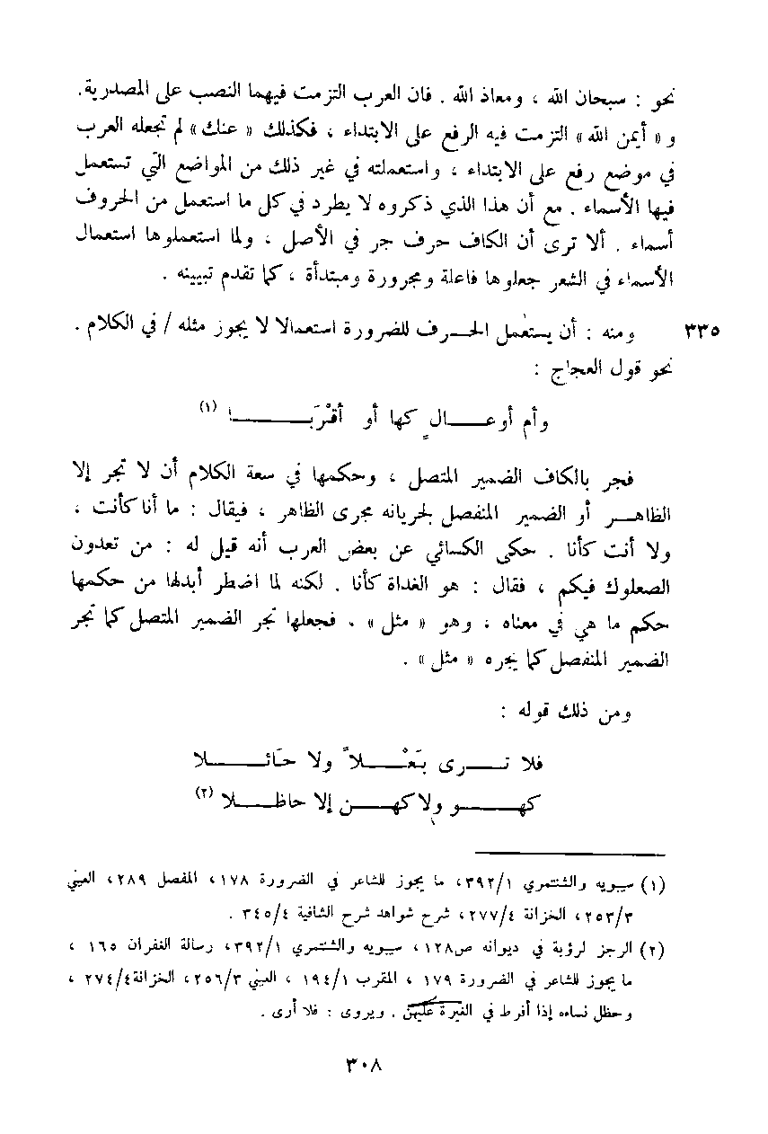 ومنه: أن يستعمل الحرف للضرورة استعمالاً لا يجوز مثله في الكلام. نحو قول العجاج: