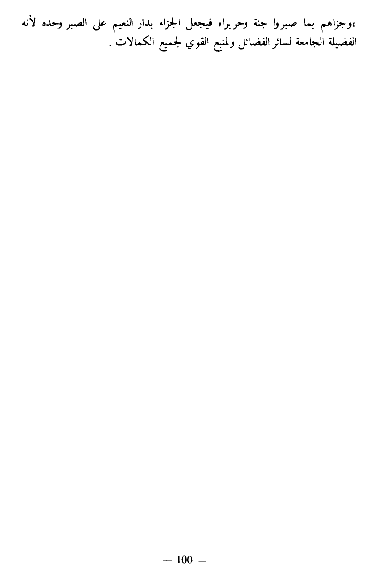 {وَجَزَاهُمْ بِمَا صَبَرُوا جَنَّةً وَحَرِيرًا} فيجعل الجزاء بدار النعيم على الصبر وحده لأنه الفضيلة الجامعة لسائر الفضائل والمنبع القوي لجميع الكمالات.