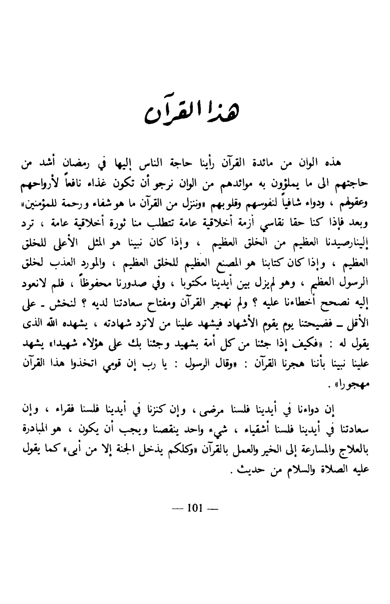 هذه ألوان من مائدة القرآن رأينا حاجة الناس إليها في رمضان أشد حاجتهم إلى ما يملؤون به موائدهم من ألوان نرجو أن تكون غذاء نافعا لأرواحهم وعقولهم، ودواء شافيا لنفوسهم وقلوبهم {وَنُنَزِّلُ مِنَ الْقُرْآنِ مَا هُوَ شِفَاءٌ وَرَحْمَةٌ لِلْمُؤْمِنِينَ} وبعد فإذا كنا حقا نقاسي أزمة أخلاقية عامة تتطلب منا ثورة أخلاقية عامة، ترد إلينا رصيدنا العظيم من الخلق العظيم، وإذا كان نبينا هو المثل الأعلى للخلق العظيم، وإذا كان كتابنا هو المصنع العظيم للخلق العظيم، والمورد العذب لخلق الرسول العظيم، وهو لم يزل بين أيدينا مكتوبا، وفي صدورنا محفوظا، فلم لا نعود إليه نصحح أخطاءنا عليه؟ ولم نهجر القرآن ومفتاح سعادتنا لديه؟ لنخش- على الأقل- فضيحتنا يوم يقوم الأشهاد فيشهد علينا من لا ترد شهادته، يشهده الله الذي يقول له: {فَكَيْفَ إِذَا جِئْنَا مِنْ كُلِّ أُمَّةٍ بِشَهِيدٍ وَجِئْنَا بِكَ عَلَى هَؤُلَاءِ شَهِيدًا} يشهد علينا نبينا بأننا هجرنا القرآن: {وَقَالَ الرَّسُولُ يَا رَبِّ إِنَّ قَوْمِي اتَّخَذُوا هَذَا الْقُرْآنَ مَهْجُورًا}.