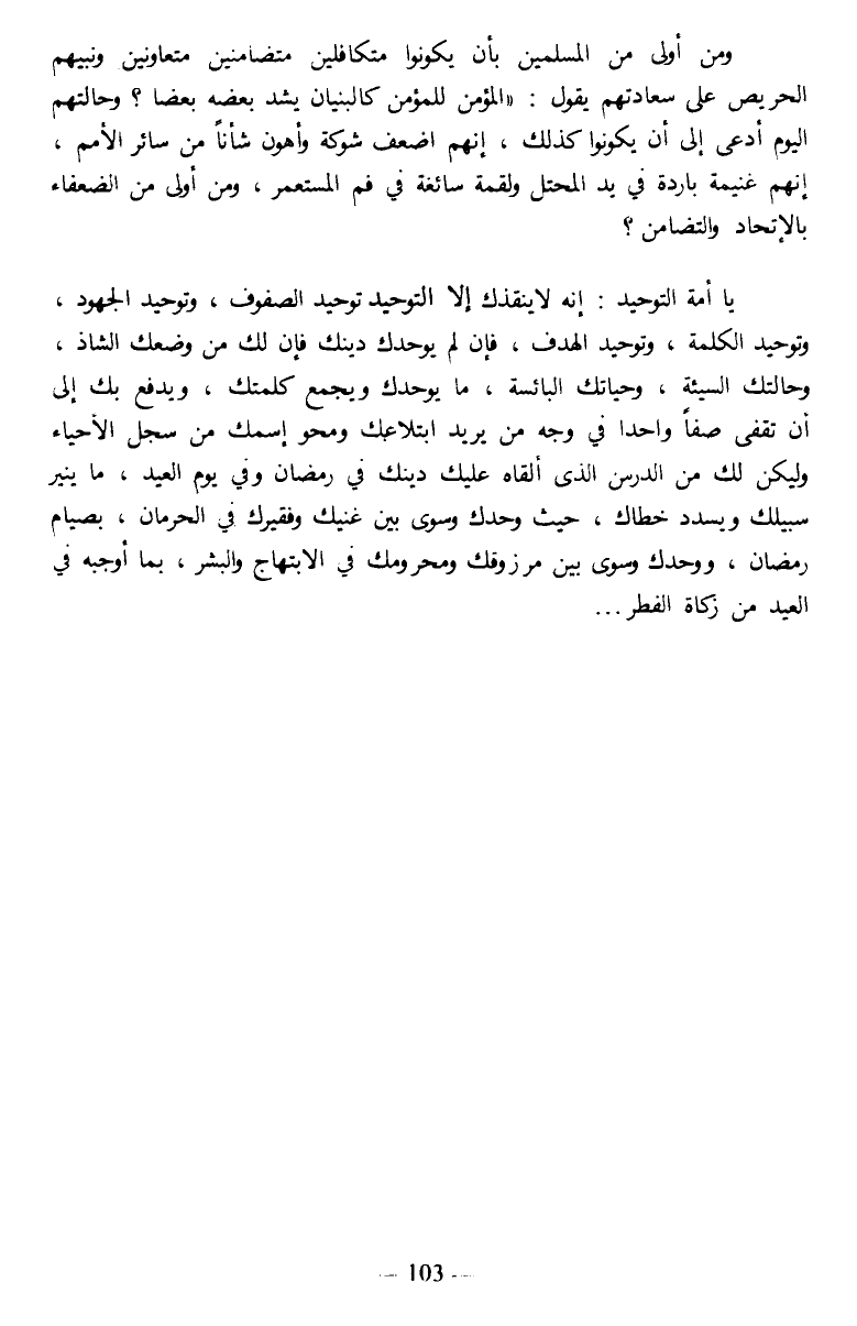 وتوحيد الكلمة، وتوحيد الهدف، فإن لم يوحدك دينك فإن لك من وضعك الشاذ، وحالتك السيئة، وحياتك البائسة، ما يوحدك ويجمع كلمتك، ويدفع بك إلى أن تقفي صفا واحدا في وجه من يريد ابتلاعك ومحو إسمك من سجل الأحياء وليكن لك من الدرس الذي ألقاه عليك دينك في رمضان وفي يوم العيد، ما ينير سبيلك ويسدد خطاك، حيث وحدك يسوي بين غنيك وفقيرك في الحرمان، بصيام رمضان، ووحدك وسوى بين مرزوقك ومحرومك في الابتهاج والبشر، بما أوجبه في العيد من زكاة الفطر ...