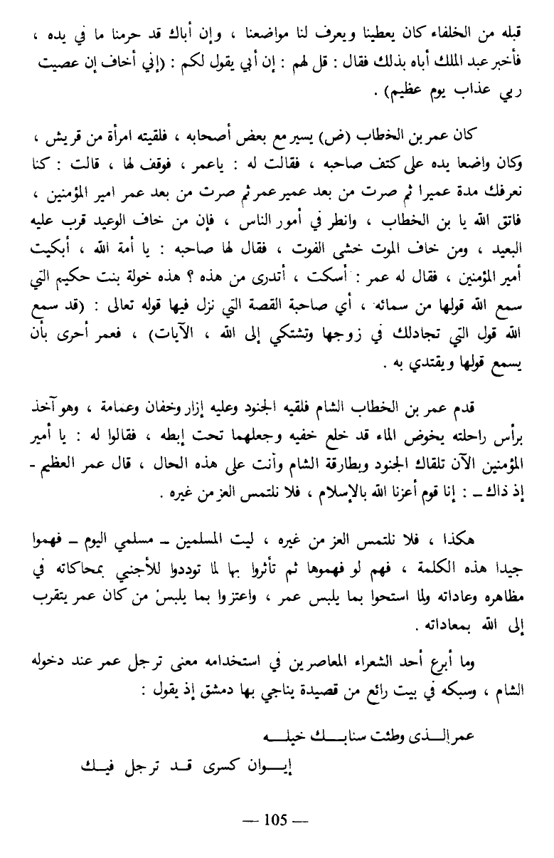 هكذا، فلا نلتمس العز من غيره، ليت المسلمين- مسلمي اليوم- فهموا جيدا هذه الكلمة، فهم لو فهموها ثم تأثروا بها لما توددوا للأجنبي بمحاكاته في مظاهره وعاداته ولما استحوا بما يلبس عمر، واعتزوا بما يلبسوا من كان عمر يتقرب إلى الله بمعاداته.
