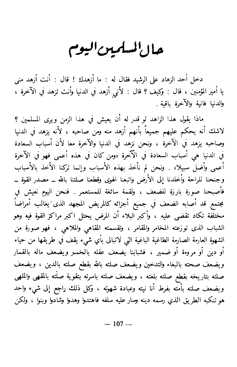 لاشك أنه يحكم عليهم جميعا بأنهم أزهد منه ومن صاحبه، لأنه يزهد في الدنيا وصاحبه يزهد في الآخرة، ونحن نزهد في الدنيا والآخرة معا لأن أسباب السعادة في الدنيا هي أسباب السعادة في الآخرة {وَمَنْ كَانَ فِي هَذِهِ أَعْمَى فَهُوَ فِي الْآخِرَةِ أَعْمَى وَأَضَلُّ سَبِيلًا}. ونحن لم نأخذ بهذه الأسباب وإنما تركنا الأخذ بالأسباب وجنحنا للراحة وأخلدنا إلى الأرض واتبعنا الهوى وقطعنا صلتنا بالله- مصدر القوة- فأصبحنا صورة بارزة للضعف، ولقمة سائغة للمستعمر. فنحن اليوم نعيش في مجتمع قد أصابه الضعف في جميع أجزائه كالمريض المجهد الذي يغالب أمراضا مختلفة تكاد تقضي عليه، وأكبر البلاء أن المرض يحتل أكبر مراكز القوه فيه وهو الشباب الذي توزعته المخامر والمقامر، وتقسمته المقاهي والملاهي، فهو صورة من الشهوة العارمة الصارمة الطاغية الباغية التي لا تبالي بأي شيء يقف في طريقها من حياء أو دين أو مروءة أو ضمير، فشبابنا يضعف عقله بالخمر ويضعف ماله بالقمار ويضعف صحته بالبغاء والتدخين ويضعف صلته بالله بقطع صلته بالدين، ويضعف صلته بتاريخه بقطع صلته بلغته، ويضعف صلته بأسرته بتقوية صفته بالمقهى والملهى ويضعف صلته بأمته بفرط أنانيته وعبادة شهوته، كل ذلك راجع إلى شيء واحد هو تنكبه الطريق الذي رسمه دينه وسار عليه سلفه فاهتدوا وهدوا وشادوا وبنوا، ولكن