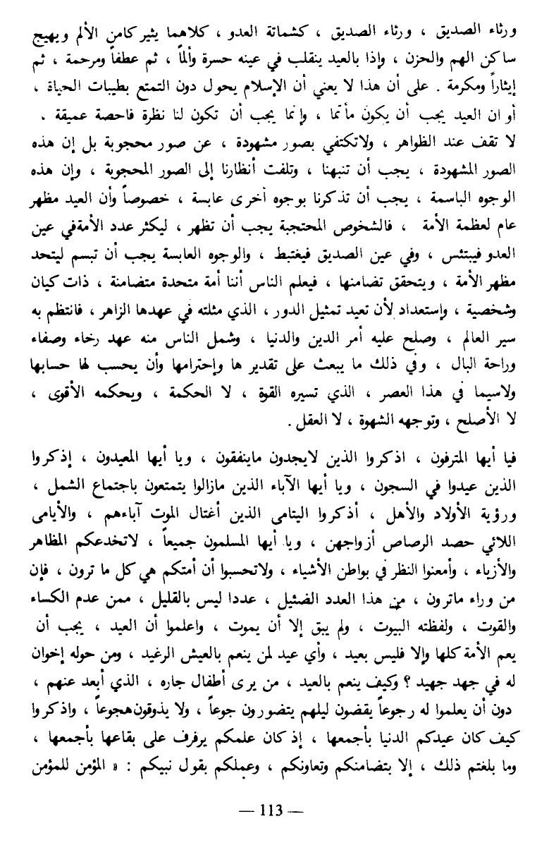 فيا أيها المترفون، اذكروا الذين لا يجدون ما ينفقون، ويا أيها المعيدون اذكروا الذين عيدوا في السجون، ويا أيها الآباء الذين مازالوا يتمتعون باجتماع الشمل، ورؤية الأولاد والأهل، أذكروا اليتامى الذين أغتال الموت آباءهم، والأيامى اللائي حصد الرصاص أزواجهن، ويا أيها المسلمون جميعا، لا تخدعكم المظاهر والأزياء، وأمعنوا النظر في بواطن الأشياء، ولا تحسبوا أن أمتكم هي كل ما ترون، فإن من وراء ما ترون، من هذا العدد الضئيل، عددا ليس بالقليل، ممن عدم الكساء والقوت، ولفظته البيوت، ولم يبق إلا أن يموت، وأعلموا أن العيد، يجب أن يعم الأمة كلها وإلا فليس بعيد، وأي عيد لمن ينعم بالعيش الرغيد، ومن حوله إخوان له في جهد جهيد؟ وكيف ينعم بالعيد، من يرى أطفال جاره، الذي أبعد عنهم، دون أن يعلموا له رجوعا يقضون ليلهم يتضورون جوعا، ولا يذوقون هجوعا، وأذكروا كيف كان عيدكم الدنيا بأجمعها، إذ كان علمكم يرفرف على بقاعها بأجمعها، وما بلغتم ذلك، إلا بتضامنكم وتعاونكم، وعملكم بقول نبيكم: "المؤمن للمؤمن