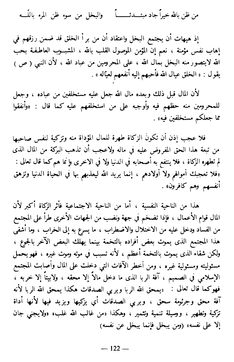 المال قوام الأعمال، فإذا تضخم في جهة ونضب من الجهات الأخرى طرأ على المجتمع من الفساد ودخل عليه من الاختلال والاضطراب، ما يسرع به إلى الخراب، وما أشقى هذا المجتمع الذي يموت بعض أفراده بالتخمة بينما يهلك البعض الآخر بالجوع، ولكن شقاء الذي يموت بالتخمة أعظم، لأنه تسبب في موته وموت غيره، فهو يحمل مسئوليته ومسئولية غيره، ومن أخطر الآفات التي دخلت على المال وأصابت المجتمع الإسلامي في الصميم، آفة الربا الذي ما دخل مالا إلا محقه، ولا بيتا إلا خربه، فهو كما قال تعالى: {يَمْحَقُ اللَّهُ الرِّبَا وَيُرْبِي الصَّدَقَاتِ} هكذا يمحق الله الربا لأنه آفة محق وجرثومة سحق، ويربي الصدقات أي يزكيها ويزيد فيها لأنها أداة تزكية وتطهير، ووسيلة تنميه وتثمير، وهكذا "من غالب الله غلب" "ولا يجني جان إلا على نفسه" {وَمَنْ يَبْخَلْ فَإِنَّمَا يَبْخَلُ عَنْ نَفْسِهِ}