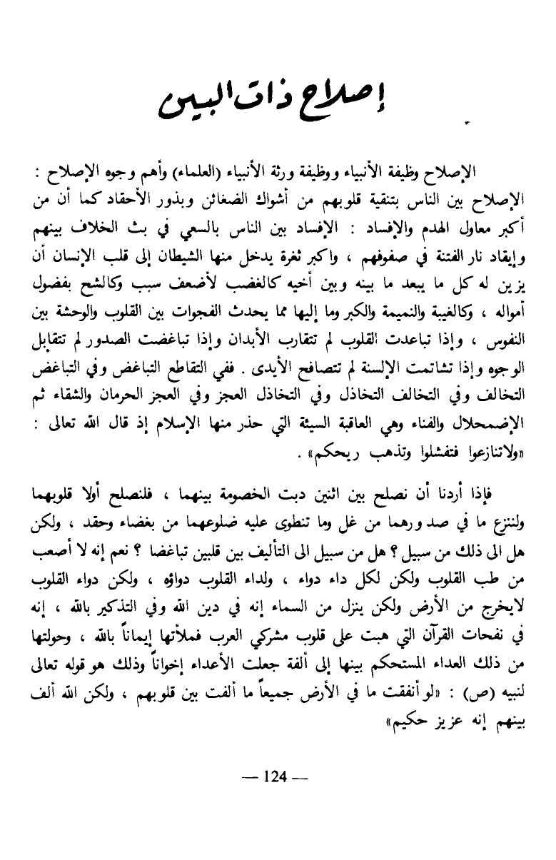 فإذا أردنا أن نصلح بين اثنين دبت الخصومة بينهما، فلنصلح أولا قلوبهما ولننزع ما في صدورهما من غل وما تنطوي عليه ضلوعهما من بغضاء وحقد، ولكن هل إلى ذلك من سبيل؟ هل من سبيل إلى التأليف بين قلبين تباغضا؟ نعم إنه لا أصعب من طب القلوب ولكن لكل داء دواء، ولداء القلوب دواؤه، ولكن دواء القلوب لا يخرج من الأرض ولكن ينزل من السماء إنه في دين الله وفي التذكير بالله، إنه في نفحات القرآن التي هبت على قلوب مشركي العرب فملأتها إيمانا بالله، وحولتها من ذلك العداء المستحكم بينها إلى ألفة جعلت الأعداء إخوانا وذلك هو قوله تعالى لنبيه صلى الله عليه وسلم: {لَوْ أَنْفَقْتَ مَا فِي الْأَرْضِ جَمِيعًا مَا أَلَّفْتَ بَيْنَ قُلُوبِهِمْ وَلَكِنَّ اللَّهَ أَلَّفَ بَيْنَهُمْ إِنَّهُ عَزِيزٌ حَكِيمٌ}