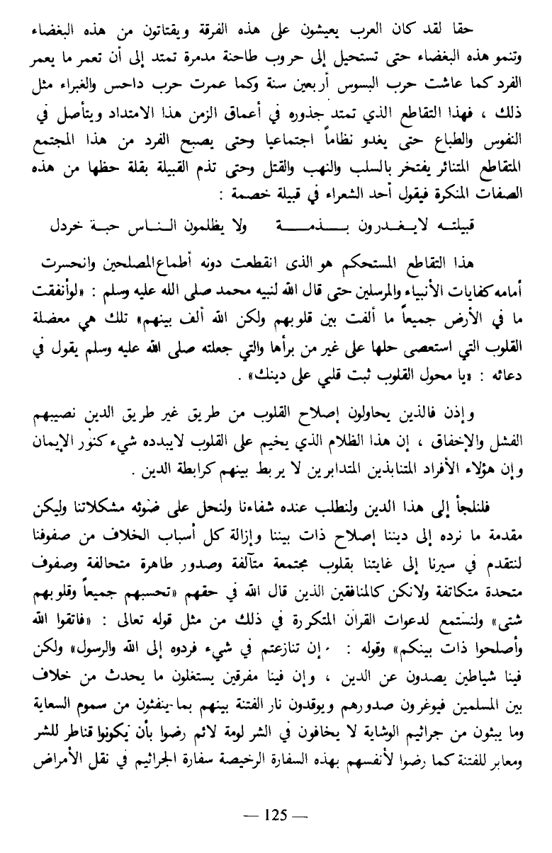 فلنلجأ إلى هذا الدين ولنطلب عنده شفاءنا ولنحل على ضوئه مشكلاتنا وليكن مقدمة ما نرده إلى ديننا إصلاح ذات بيننا وإزالة كل أسباب الخلاف من صفوفنا لنتقدم في سيرنا إلى غايتنا بقلوب مجتمعة متآلفة وصدور طاهرة متحالفة وصفوف متحدة متكاتفة ولا نكن كالمنافقين الذين قال الله في حقهم: {تَحْسَبُهُمْ جَمِيعًا وَقُلُوبُهُمْ شَتَّى} ولنستمع لدعوات القرآن المتكررة في ذلك من مثل قوله تعالى: {فَاتَّقُوا اللَّهَ وَأَصْلِحُوا ذَاتَ بَيْنِكُمْ} وقوله: {فَإِنْ تَنَازَعْتُمْ فِي شَيْءٍ فَرُدُّوهُ إِلَى اللَّهِ وَالرَّسُولِ} ولكن فينا شياطين يصدون عن الدين، وإن فينا مفرقين يستغلون ما يحدث من خلاف بين المسلمين فيوغرون صدورهم ويوقدون نار الفتنة بينهم بما ينفثون من سموم السعاية وما يبثون من جراثيم الوشاية لا يخافون في الشر لومة لائم رضوا بأن يكونوا قناطر للشر ومعابر للفتنة كما رضوا لأنفسهم بهذه السفارة الرخيصة سفارة الجراثيم في نقل الأمراض
