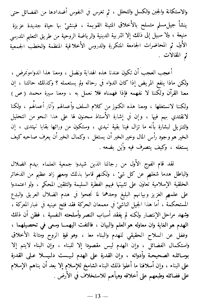والاستكانة والجبن والكسل والتحلل، ثم تغرس في نفوس أضدادها من الفضائل حتى ينشأ جيل مسلم متسلح بالأخلاق المتينة القويمة، فينشئ بها حياة جديدة عزيزة منيعة، ولا سبيل إلى ذلك إلا التربية الدينية والرياضة الروحية من طريق التعليم المدرسي الأول ثم المحاضرات الجامعة المتكررة والدروس الأخلاقية المنظمة والخطب الجمعيه ثم المقالات.