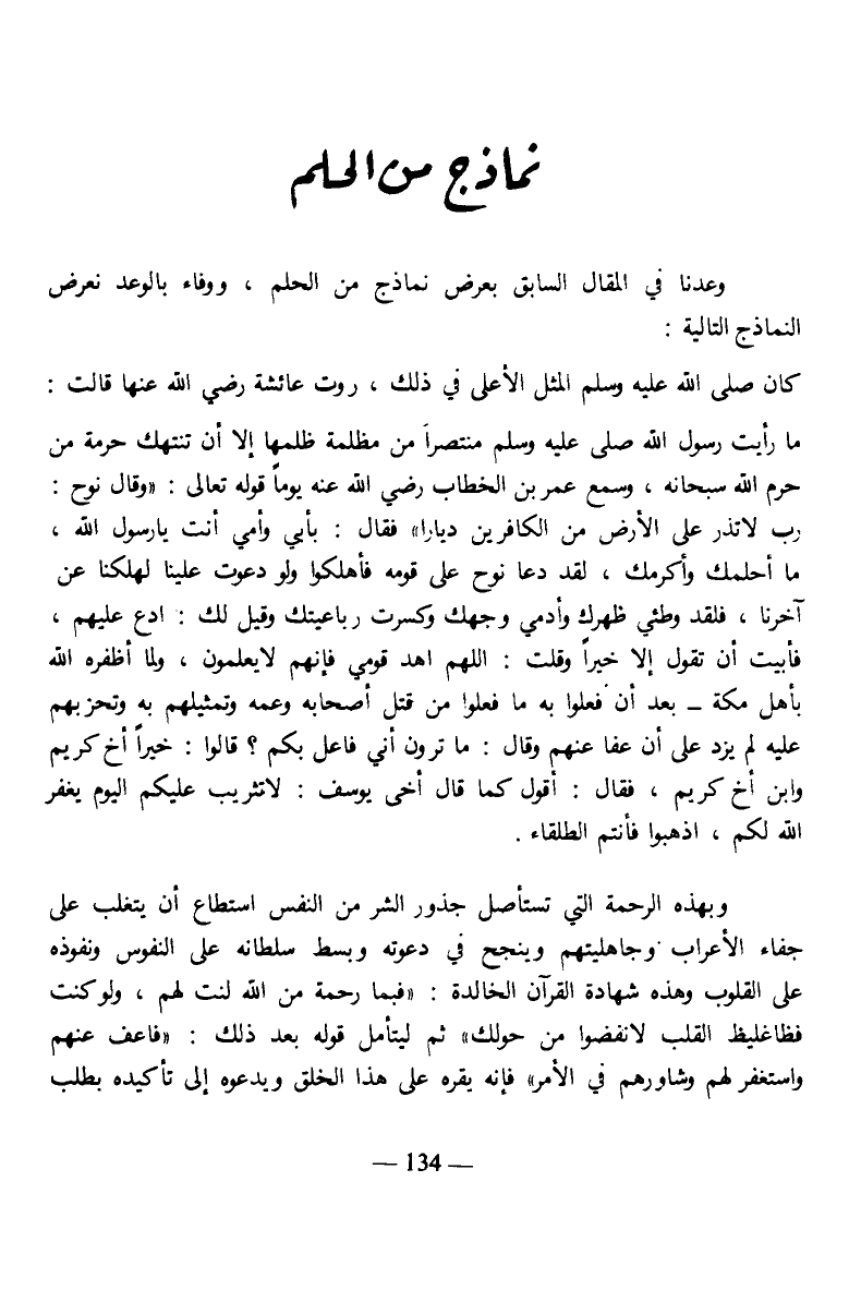 كان صلى الله عليه وسلم المثل الأعلى في ذلك، روت عائشة رضي الله عنها قالت: ما رأيت رسول الله صلى عليه وسلم منتصرا من مظلمة ظلمها إلا أن تنتهك حرمة من حرم الله سبحانه، سمع عمر بن الخطاب رضي الله عنه يوما قوله تعالى: {وَقَالَ نُوحٌ رَبِّ لَا تَذَرْ عَلَى الْأَرْضِ مِنَ الْكَافِرِينَ دَيَّارً} فقال: بأبي وأمي أنت يا رسول الله، ما أحلمك وأكرمك، لقد دعا نوح على قومه فأهلكوا ولو دعوت علينا لهلكنا عن آخرنا، فلقد وطئي ظهرك وأدمي وجهك وكسرت رباعيتك وقيل لك: ادع عليهم، فأبيت أن تقول إلا خيرا وقلت: اللهم اهد قومي فإنهم لا يعلمون، ولما أظفره الله بأهل مكة- بعد أن فعلوا به ما فعلوا من قتل أصحابه وعمه وتمثيلهم به وتحزبهم عليه لم يزد على أن عفا عنهم وقال: ما ترون أني فاعل بكم؟ قالوا: خيرا أخ كريم وابن أخ كريم، فقال: أقول كما قال أخي يوسف: لا تثريب عليكم اليوم يغفر الله لكم، اذهبوا فأنتم الطلقاء.