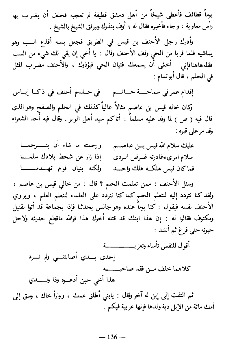 وسئل الأحنف: ممن تعلمت الحلم؟ قال: من خالي قيس بن عاصم، ولقد كنا نتردد إليه لنتعلم الحلم كما كنا نتردد على العلماء لنتعلم العلم، ويروي الأحنف نفسه فيقول: كنا يوما عنده وهو جالس يحدثنا فإذا بجماعة قد أتوا بقتيل ومكتوف فقالوا له: إن هذا ابنك قد قتله أخوك هذا فوالله ما قطع حديثه ولا حل حبوته حتى فرغ ثم أنشد: