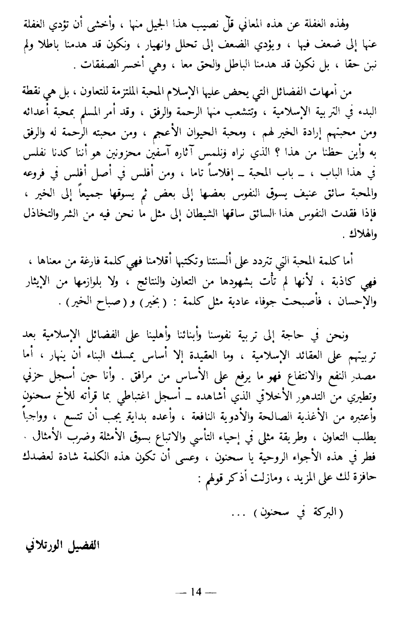 ونحن في حاجة إلى تربية نفوسنا وأبنائنا وأهلينا على الفضائل الإسلامية بعد تربيتهم على العقائد الإسلاممة، وما العقيدة إلا أساس يمسك البناء أن ينهار، أما مصدر النفع والآنتفاع فهو ما يرفع على الأساس من مرافق. وأنا حين أسجل حزني وتطيري من التدهر الأخلاقي الذي أشاهده - أسجل اغتباطي بما قرأته للأخ سحنون وأعتبره من الأغذية الصالحة والأدويه النافعة، وأعده بداية يجب أن تتسع، وواجبا يطلب التعاون، وطريقة مثلى في إحياء التأسي والاتباع بسوق الأمثلة وضرب الأمثال. فطر في هذه الأجواء الروحية يا سحنون، وعسى أن تكون هذه الكلمة شادة لعضدك حافزة لك على المزيد، ومازلت أذكر قولهم: