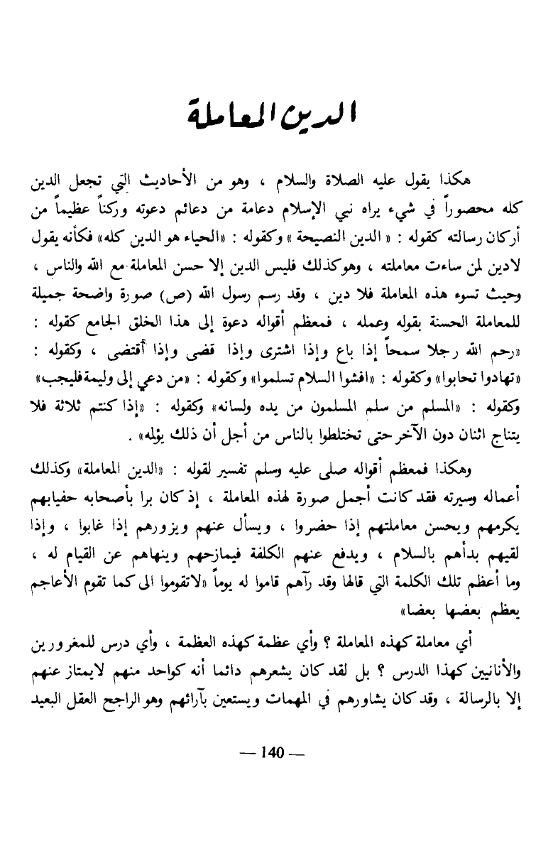 هكذا يقول عليه الصلاة والسلام، وهو من الأحاديث التي تجعل الدين كله محصورا في شيء يراه قي الإسلام دعامة من دعائم دعوته وركنا عظيما من أركان رسالته كقوله: "الدين النصيحة" وكقوله: "الحياء هو الدين كله" فكأنه يقول لا دين لمن ساءت معاملته، وهو كذلك فليس الدين إلا حسن المعاملة مع الله والناس وحيث تسوء هذه المعاملة فلا دين، وقد رسم رسول الله صلى الله عليه وسلم صورة واضحة جميلة للمعاملة الحسنة بقوله وعمله، فمعظم أقواله دعوة إلى هذا الخلق الجامع كقوله: "رحم الله رجلا سمحا إذا باع وإذا اشترى وإذا قضى وإذا اقتضى" وكقوله: "تهادوا تحابوا" وكقوله: "افشوا السلام تسلموا" وكقوله: "من دعي إلى وليمه فليجب" وكقوله: "المسلم من سلم المسلمون من يده ولسانه" وكقوله: "إذا كنتم ثلاثة فلا يتناج اثنان دون الآخر حتى تختلطوا بالناس من أجل أن ذلك يؤلمه".