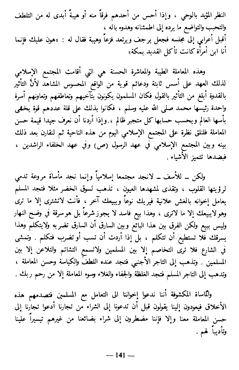 والمأساة المكشوفة أننا ندعوا إخواننا إلى التعامل مع المسلمين فتصدمهم هذه الأخلاق فيعودون إلينا يقولون قبل أن تدعونا إلى الشراء من تجارنا أدعوا تجارنا إلى حسن المعاملة معنا وإلا فإننا مضطرون إلى شراء بضائعنا من غيرهم تيسيرا علينا وتأديبا لهم.