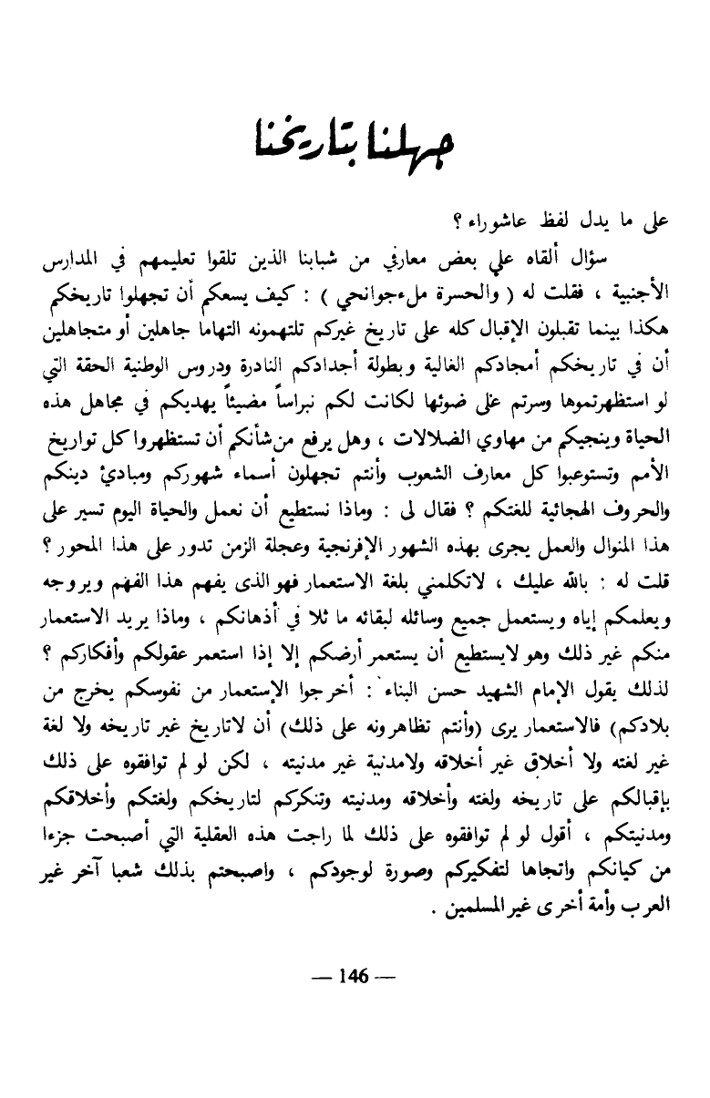 سؤال ألقاه علي بعض معارفي من شبابنا الذين تلقوا تعليمهم في المدارس الأجنبية، فقلت له (والحسرة ملء جوانحي): كيف يسعكم أن تجهلوا تاريخكم هكذا بينما تقبلون الإقبال كله على تاريخ غيركم تلتهمونه التهاما جاهلين أو متجاهلين أن في تاريخكم أمجادكم الغالية وبطولة أجدادكم النادرة ودروس الوطنية الحقة التي لو استظهرتموها وسرتم على ضوئها لكانت لكم نبراسا مضيئا يهديكم في مجاهل هذه الحياة وينجيكم من مهاوي الضلالات، وهل يرفع من شأنكم أن تستظهروا كل تواريخ الأمم وتستوعبوا كل معارف الشعوب وأنتم تجهلون أسماء شهوركم ومبادئ دينكم والحروف الهجائية للغتكم؟ فقال لي: وماذا نستطيع أن نعمل والحياة اليوم تسير على هذا المنوال والعمل يجرى بهذه الشهور الإفرنجية وعجلة الزمن تدور على هذا المحور؟ قلت له: بالله عليك، لا تكلمني بلغة الاستعمار فهو الذي يفهم هذا الفهم ويروجه ويعلمكم إياه ويستعمل جميع وسائله لبقائه ماثلا في أذهانكم، وماذا يريد الاستعمار منكم غير ذلك وهو لا يستطيع أن يستعمر أرضكم إلا إذا استعمر عقولكم وأفكاركم؟ لذلك يقول الإمام الشهيد حسن البناء: (أخرجوا الإستعمار من نفوسكم يخرج من بلادكم) فالاستعمار يرى (وأنتم تظاهرونه على ذلك) أن لا تاريخ غير تاريخه ولا لغة غير لغته ولا أخلاق غير أخلاقه ولا مدنية غير مدنيته، لكن لو لم توافقوه على ذلك بإقبالكم على تاريخه ولغته وأخلاقه ومدنيته وتنكركم لتاريخكم ولغتكم وأخلاقكم ومدنيتكم، أقول لو لم توافقوه على ذلك لما راجت هذه العقلية التي أصبحت جزءا من كيانكم وإتجاها لتفكيركم وصورة لوجودكم، وأصبحتم بذلك شعبا آخر غير العرب وأمة أخرى غير المسلمين.