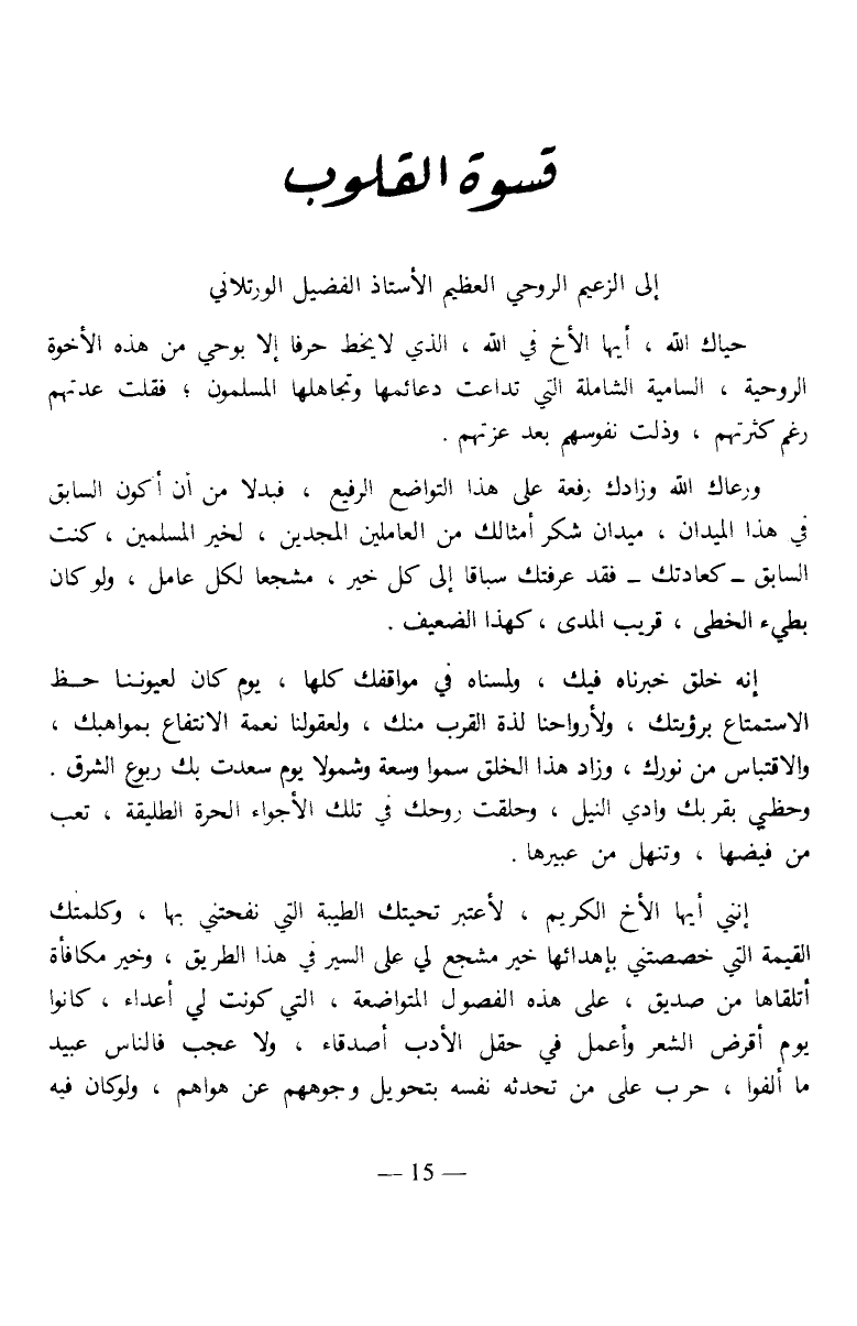 إنني أيها الأخ الكريم، لأعتبر تحيتك الطيبة التي نفحتني بها، وكلمتك القيمة التي خصصتني بإهدائها خير مشجع لي على السير في هذا الطريق، وخير مكافأة أتلقاها من صديق، على هذه الفصول المتواضعة، التي كونت لي أعداء، كانوا يوم أقرض الشعر وأعمل في حقل الأدب أصدقاء، ولا عجب فالناس عبيد ما ألفوا، حرب على من تحدثه نفسه بتحويل وجوههم عن هواهم، ولو كان فيه