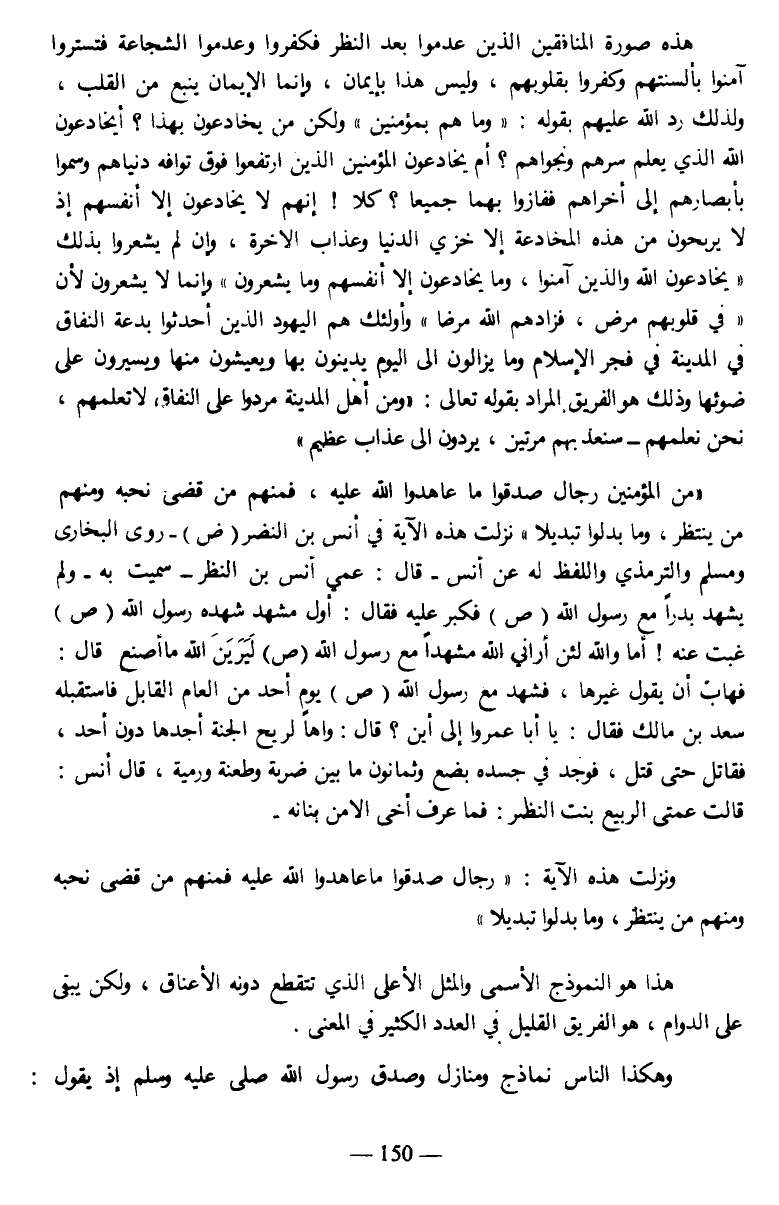 {مِنَ الْمُؤْمِنِينَ رِجَالٌ صَدَقُوا مَا عَاهَدُوا اللَّهَ عَلَيْهِ فَمِنْهُمْ مَنْ قَضَى نَحْبَهُ وَمِنْهُمْ مَنْ يَنْتَظِرُ وَمَا بَدَّلُوا تَبْدِيلًا} نزلت هذه الآية في أنس بن النضر رضي الله عنه - روى البخارى ومسلم والترمذي واللفظ له عن أنس- قال: عمي أنس بن النظر - سميت به- ولم يشهد بدرا مع وسول الله صلى الله عليه وسلم فكبر عليه فقال: أول مشهد شهده رسول الله صلى الله عليه وسلم غبت عنه! أما والله لئن أراني الله مشهدا مع رسول الله صلى الله عليه وسلم ليرين الله ما أصنع قال: فهاب أن يقول غيرها، فشهدء رسول الله صلى الله عليه وسلم يوم أحد من العام القابل فاستقبله سعد بن مالك فقال: يا أبا عمروا إلى أين؟ قال: واها لريح الجنة أجدها دون أحد، فقاتل حتى قتل، فوجد في جسده بضع وثمانون ما بين ضربة وطعنة ورمية، قال أنس: قالت عمتي الربيع بنت النظر: فما عرف أخي إلا من بنانه.