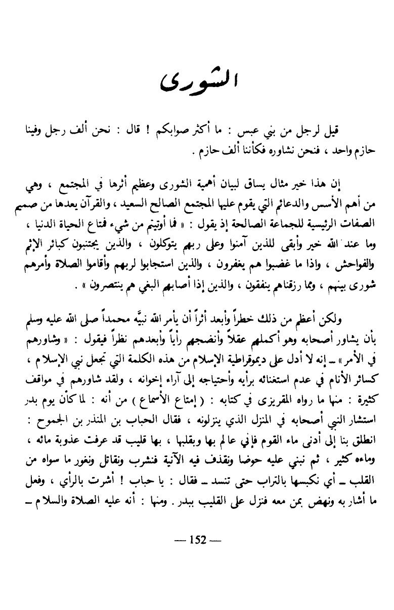 ولكن أعظم من ذلك خطرا وأبعد أثرا أن يأمر الله نبيه محمدا صلى الله عليه وسلم بأن يشاور أصحابه وهو أكملهم عقلا وأنضجهم رأيا وأبعدهم نظرا فيقول: {وَشَاوِرْهُمْ فِي الْأَمْرِ} - إنه لا أدل على ديمقراطية الإسلام من هذه الكلمة التي تجعل نبي الإسلام، كسائر الأنام في عدم استغنائه برأيه واحتياجه إلى آراء إخوانه، ولقد شاورهم في مواقف كثيرة: منها ما رواه المقريزي في كتابه: (إمتاع الأسماع) من أنه: لما كان يوم بدر استشار النبي أصحابه في المنزل الذي ينزلونه، فقال الحباب بن المنذر بن الجموح: انطلق بنا إلى أدنى ماء القوم فإني عالم بها وبقلبها، بها قليب قد عرفت عذوبة مائه، وماءه كثير، ثم نبني عليه حوضا ونقذف فيه الآنية فنشرب ونقاتل ونغور ما سواه من القلب- أي نكبسها بالتراب حتى تنسد- فقال: يا حباب! أشرت بالرأي، وفعل ما أشار به ونهض بمن معه فنزل على القليب ببدر. ومنها: أنه عليه الصلاة والسلام-