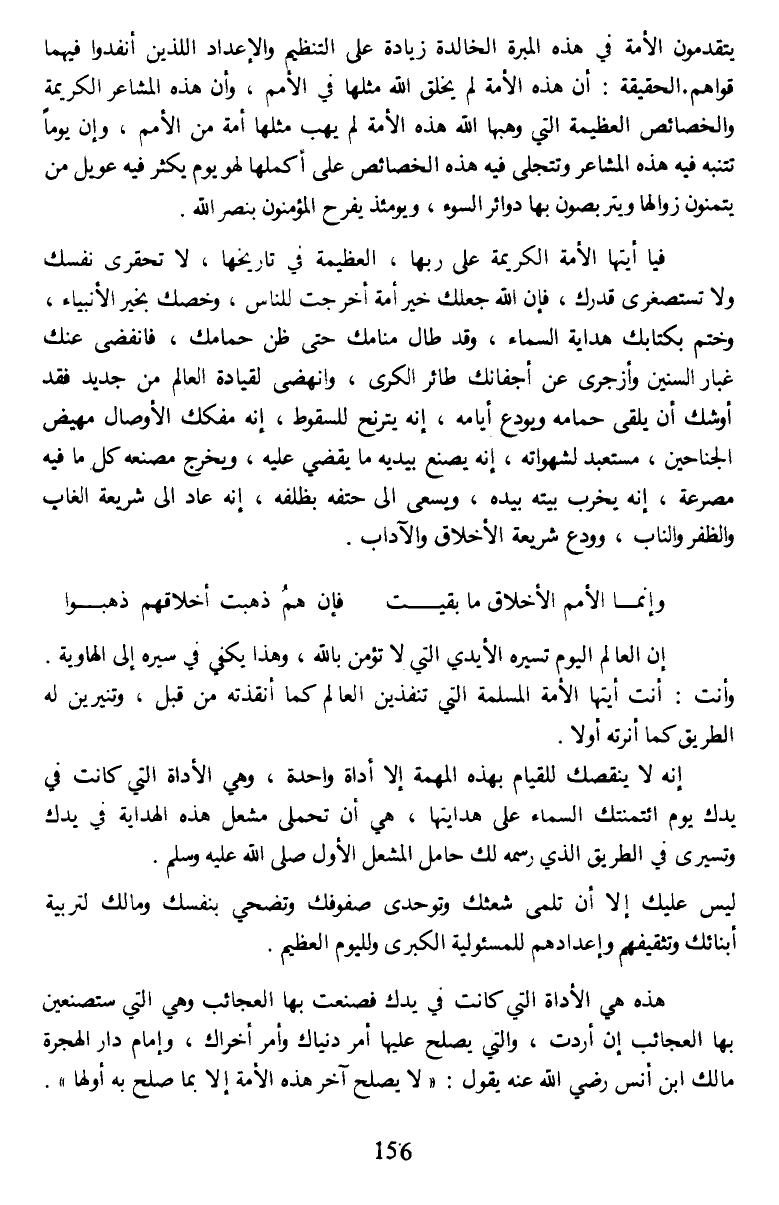 يدك يوم ائتمنتك السماء على هدايتها، هي أن تحملي مشعل هذه الهداية في يدك وتسيري في الطريق الذي رسمه لك حامل المشعل الأول صلى الله عليه وسلم. ليس عليك إلا أن تلمي شعثك وتوحدي صفوفك وتضحي بنفسك ومالك لتربية أبنائك وتثقيفهم وإعدادهم للمسئولية الكبرى ولليوم العظيم.