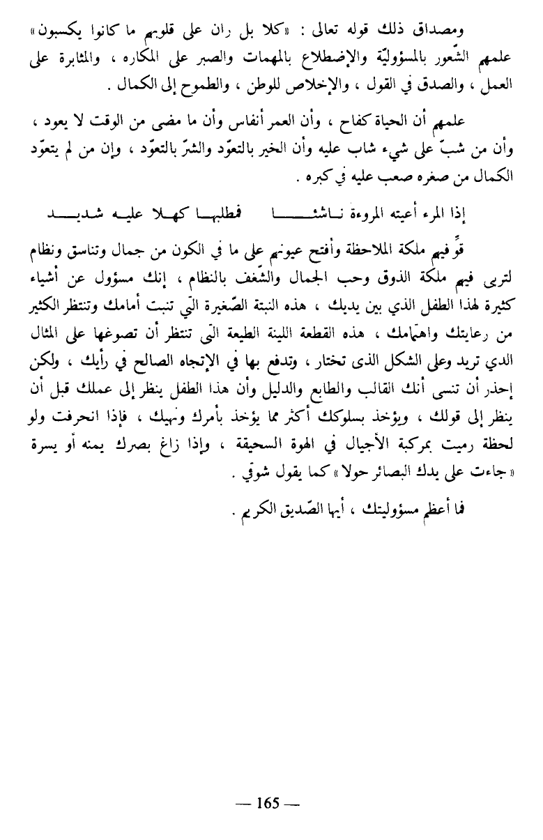 قو فيهم ملكة الملاحظة وأفتح عيونهم على ما في الكون من جمال وتناسق ونظام لترى فيهم ملكة الذوق وحب الجمال والشغف بالنظام، إنك مسؤول عن أشياء كثيرة لهذا الطفل الذي بين يديك، هذه النبتة الصغيرة التي تنبت أمامك وتنتظر الكثير من رعايتك واهتمامك، هذه القطعة اللينة الطيعة التي تنتظر أن تصوغها على المثال الذي تريد وعلى الشكل الذي تختار، وتدفع بها في الإتجاه الصالح في رأيك، ولكن إحذر أن تنسى أنك القالب والطابع والدليل وأن هذا الطفل ينظر إلى عملك قبل أن ينظر إلى قولك، ويؤخذ بسلوكك أكثر مما يؤخذ بأمرك ونهيك، فإذا انحرفت ولو لحظة رميت بمركبة الأجيال في الهوة السحيقة، وإذا زاغ بصرك يمنة أو يسرة "جاءت على يدك البصائر حولا" كما يقول شوقي.