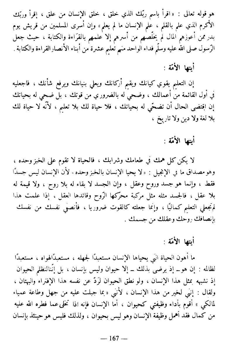 في أول القائمه من أعمالك، وضحي له بالضروري من قوتك، بل ضحي له بحياتك إن اقتضى الحال أن تضحي له بحياتك، فلا حياة لك بلا تعليم، لأنه لا حياه لك بلا لغة ولا دين ولا تاريخ.