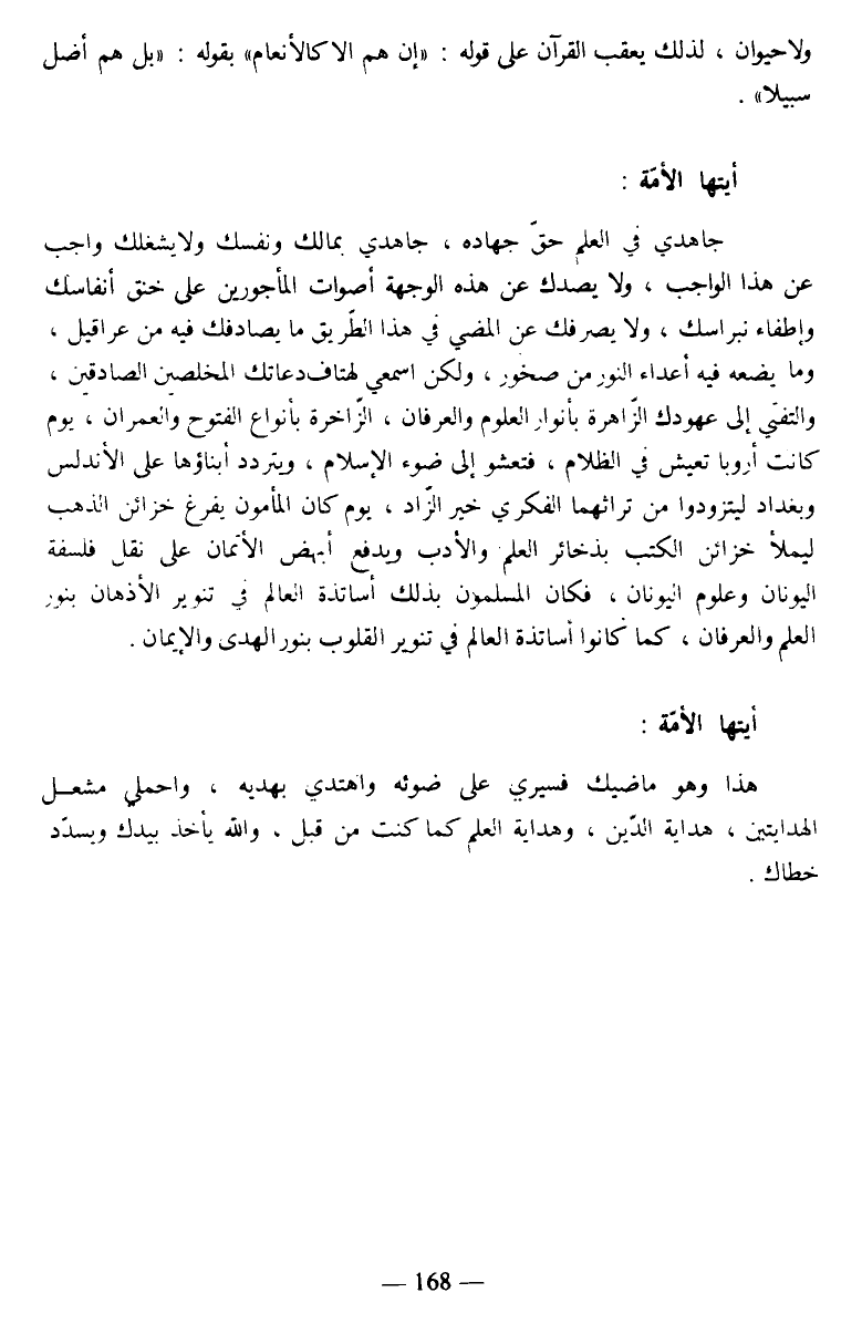 عن هذا الواجب، ولا يصدك عن هذه الوجهة أصوات المأجورين على خنق أنفاسك وإطفاء نبراسك، ولا يصرفك عن المضي في هذا الطريق ما يصادفك فيه من عراقيل، وما يضعه فيه أعداء النور من صخور، ولكن اسمعي لهتاف دعاتك المخلصين الصادقين، والتفتي إلى عهودك الزاهرة بأنوار العلوم والعرفان، الزاخرة بأنواع الفتوح والعمران، يوم كانت أروبا تعيش في الظلام، فتعشو إلى ضوء الإسلام، ويتردد أبناؤها على الأندلس وبغداد ليتزودوا من تراثهما الفكري خير الزاد، يوم كان المأمون يفرغ خزائن الذهب ليملأ خزائن الكتب بذخائر العلم والأدب ويدفع أبهض الأثمان على نقل فلسفة اليونان وعلوم اليونان، فكان المسلمون بذلك أساتذة العالم في تنوير الأذهان بنور العلم والعرفان، كما كانوا أساتذة العالم في تنوير القلوب بنور الهدى والإيمان.