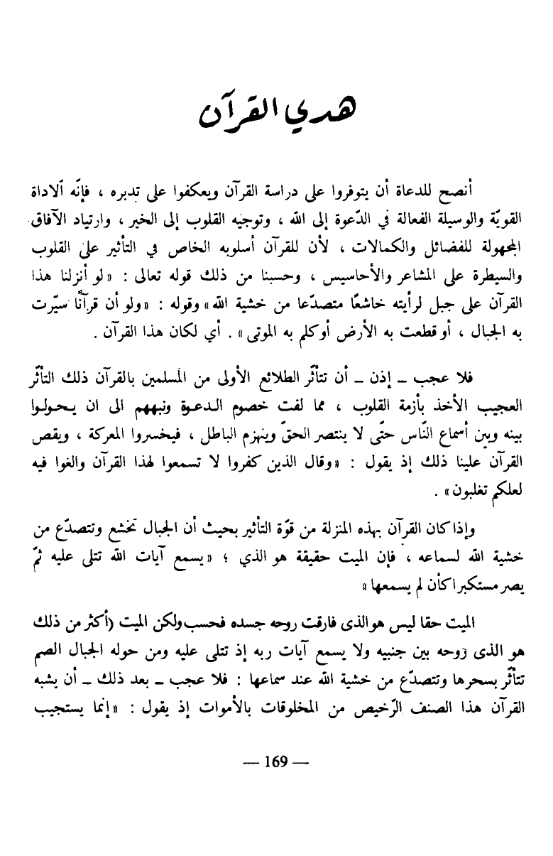 القوية والوسيلة الفعالة في الدعوة إلى الله، وتوجيه القلوب إلى الخير، وارتياد الآفاق المجهولة للفضائل والكمالات، لأن للقرآن أسلوبه الخاص في التأثير على القلوب والسيطرة على المشاعر والأحاسيس، وحسبنا من ذلك قوله تعالى: {لَوْ أَنْزَلْنَا هَذَا الْقُرْآنَ عَلَى جَبَلٍ لَرَأَيْتَهُ خَاشِعًا مُتَصَدِّعًا مِنْ خَشْيَةِ اللَّهِ} وقوله: {وَلَوْ أَنَّ قُرْآنًا سُيِّرَتْ بِهِ الْجِبَالُ أَوْ قُطِّعَتْ بِهِ الْأَرْضُ أَوْ كُلِّمَ بِهِ الْمَوْتَى}. أي لكان هذا القرآن.