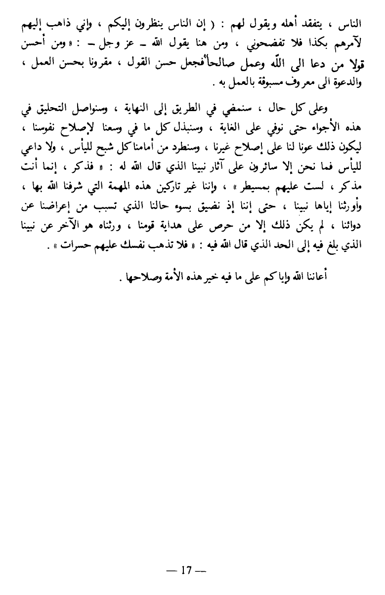 وعلى كل حمال، سنمضي في الطريق إلى النهاية، وسنواصل التحليق في هذه الأجواء حتى نوفي على الغاية، وسنبذل كل ما في وسعنا لإصلاح نفوسنا، ليكون ذلك عونا لنا على إصلاح غيرنا، وسنطرد من أمامنا كل شبح لليأس، ولا داعي لليأس فما نحن إلا سائرون على آثار نبينا الذي قال الله له: {فَذَكِّرْ إِنَّمَا أَنْتَ مُذَكِّرٌ * لَسْتَ عَلَيْهِمْ بِمُصَيْطِرٍ}، وإننا غير تاركين هذه المهمة التي شرفنا الله بها، وأورثنا إياها نبينا، حتى إننا إذ نضيق بسوء حالنا الذي تسبب من إعراضنا عن دوائنا، لم يكن ذلك إلا من حرص على هداية قومنا، ورثناه هو الآخر عن نبينا الذي بلغ فيه إلى الحد الذي قال الله فيه: {فَلَا تَذْهَبْ نَفْسُكَ عَلَيْهِمْ حَسَرَاتٍ}.