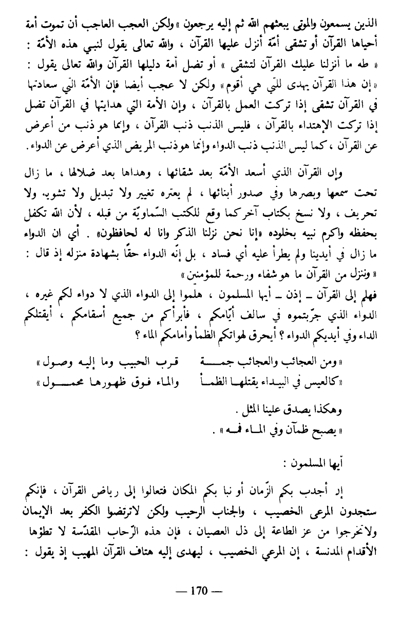 الَّذِينَ يَسْمَعُونَ وَالْمَوْتَى يَبْعَثُهُمُ اللَّهُ ثُمَّ إِلَيْهِ يُرْجَعُونَ} ولكن العجب العاجب أن تموت أمة أحياها القرآن أو تشقى أمة أنزل عليها القرآن، والله تعالى يقول لنبي هذه الأمة: {طه * مَا أَنْزَلْنَا عَلَيْكَ الْقُرْآنَ لِتَشْقَى} أو تضل أمة دليلها القرآن والله تعالى يقول: {إِنَّ هَذَا الْقُرْآنَ يَهْدِي لِلَّتِي هِيَ أَقْوَمُ} ولكن لا عجب أيضا فإن الأمة التي سعادتها في القرآن تشقى إذا تركت العمل بالقرآن، وإن الأمة التي هدايتها في القرآن تضل إذا تركت الإهتداء بالقرآن، فليس الذنب ذنب القرآن، وإنما هو ذنب من أعرض عن القرآن، كما ليس الذنب ذنب الدواء وإنما هو ذنب المريض الذي أعرض عن الدواء.