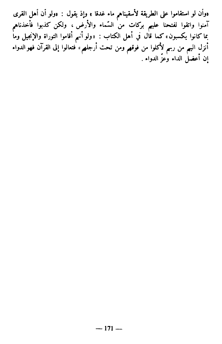 {وَأَلَّوِ اسْتَقَامُوا عَلَى الطَّرِيقَةِ لَأَسْقَيْنَاهُمْ مَاءً غَدَقًا} وإذ يقول: {وَلَوْ أَنَّ أَهْلَ الْقُرَى آمَنُوا وَاتَّقَوْا لَفَتَحْنَا عَلَيْهِمْ بَرَكَاتٍ مِنَ السَّمَاءِ وَالْأَرْضِ وَلَكِنْ كَذَّبُوا فَأَخَذْنَاهُمْ بِمَا كَانُوا يَكْسِبُونَ} كما قال في أهل الكتاب: {وَلَوْ أَنَّهُمْ أَقَامُوا التَّوْرَاةَ وَالْإِنْجِيلَ وَمَا أُنْزِلَ إِلَيْهِمْ مِنْ رَبِّهِمْ لَأَكَلُوا مِنْ فَوْقِهِمْ وَمِنْ تَحْتِ أَرْجُلِهِمْ} فتعالوا إلى القرآن فهو الدواء إن أعضل الداء وعز الدواء.